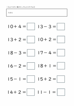 このプリントは、小学校1年生の「10より大きい数」の学習内容を定着させることを目的に作られています。10より大きい数の理解は、二桁の計算に入るうえで欠かせない重要な基礎です。このプリントでは、10+1桁のたし算や、十何−1桁のひき算といった、学習したばかりの内容を確実に身につけるための計算問題を扱っています。単に計算するだけでなく、十のまとまりを意識しながら計算する習慣を育てることを目指しています。
