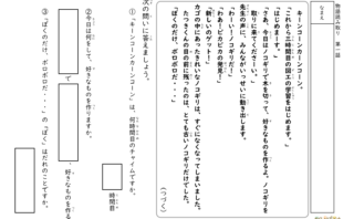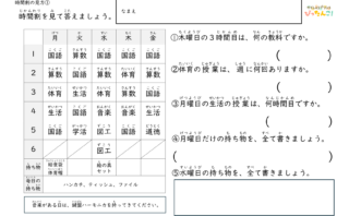 このプリントは、学校の時間割を見ながら問いに答える読み取り学習プリントです。「木曜日の3時間目は何の教科ですか」「体育は週に何回ありますか」「水曜日の持ち物を書きましょう」などの問題に取り組みます。時間割には教科だけでなく、持ち物や特別なお...