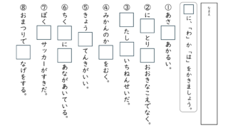 このプリントは、「は・わ」「を・お」「へ・え」の使い分けを身につけるための教材です。短い文章の中に空欄があり、文脈を読んで正しい助詞を書き入れる構成になっています。音だけでは判断できないため、助詞の役割を理解しながら取り組むことができ、日本...