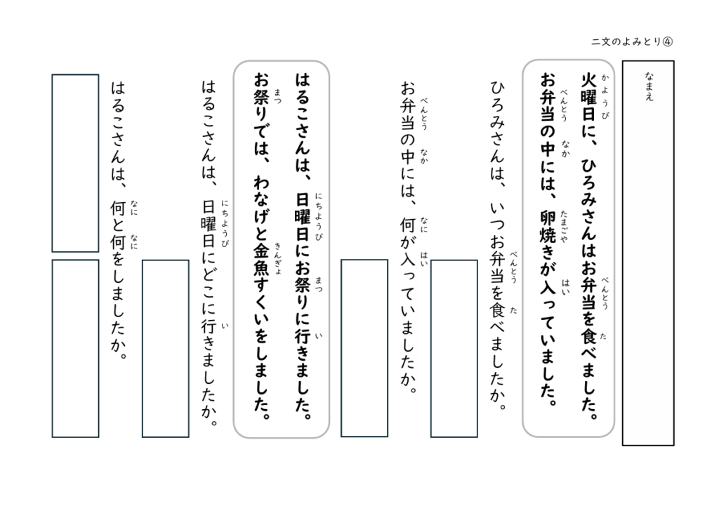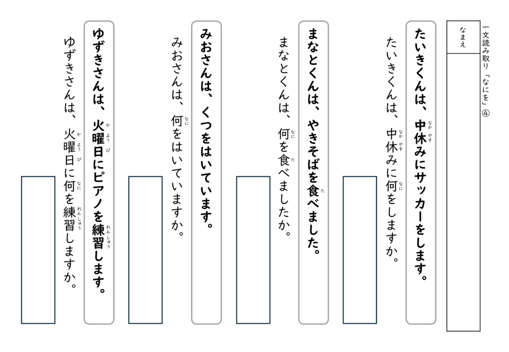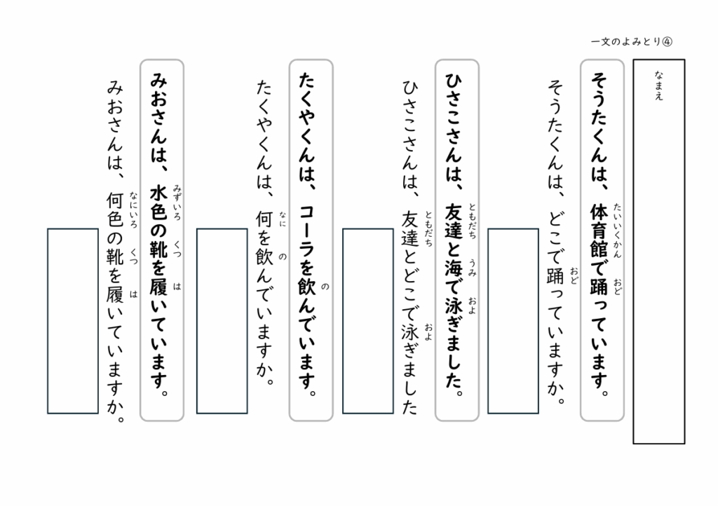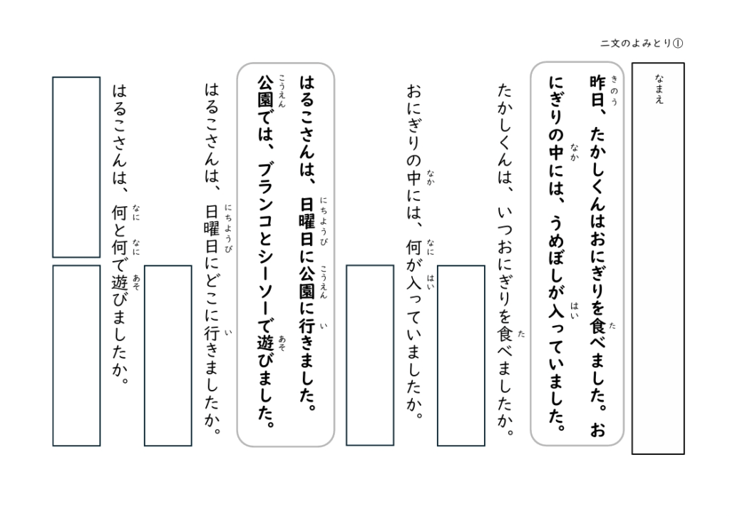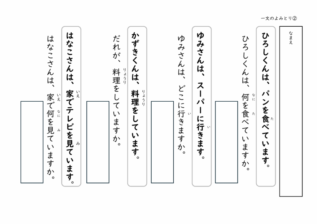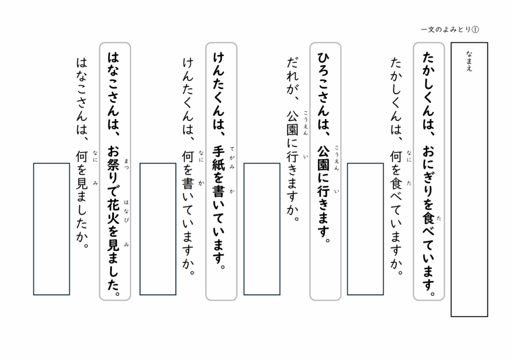「たかしくんは、おにぎりを食べています。」→「たかしくんは、何を食べていますか?」のように、答えが文中にあるシンプルな設計なので、読解が苦手なお子さんでも取り組みやすい内容です。