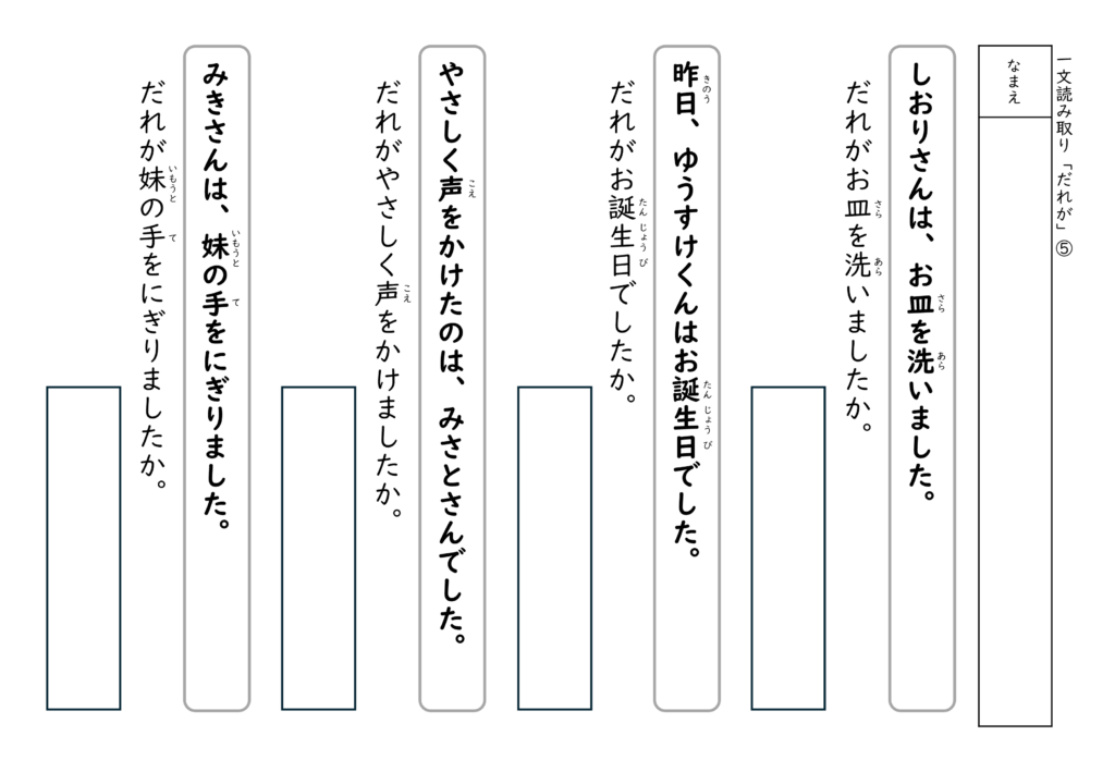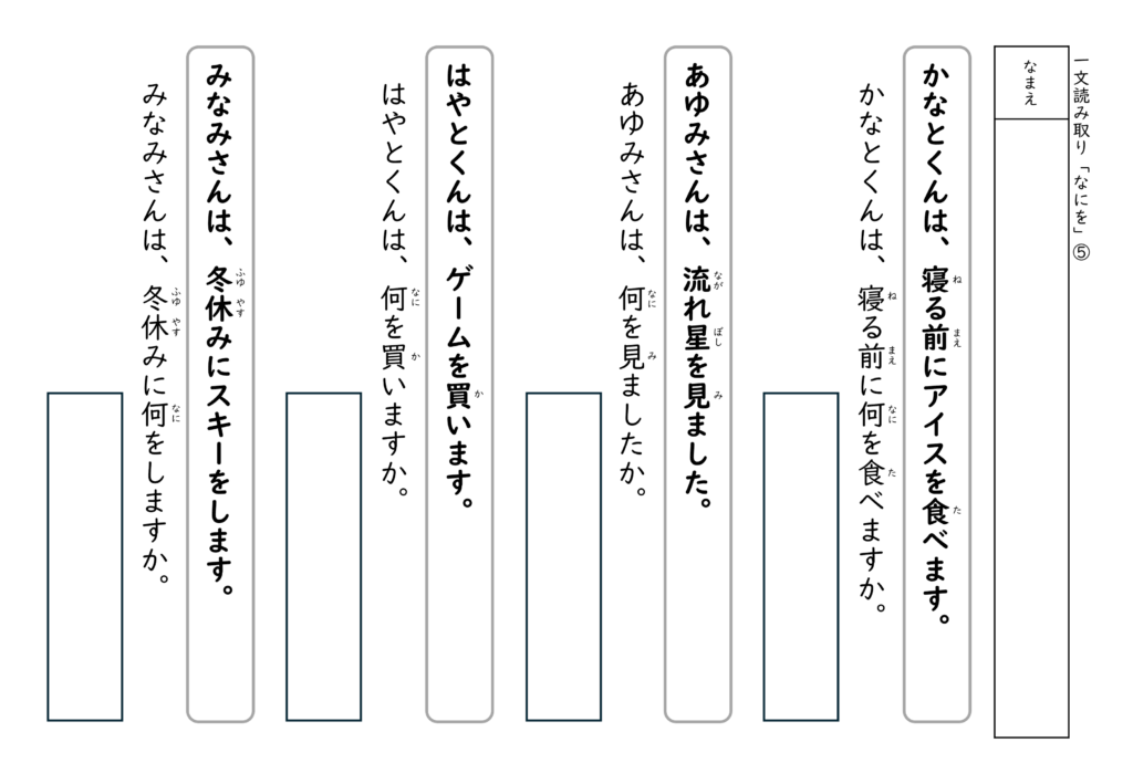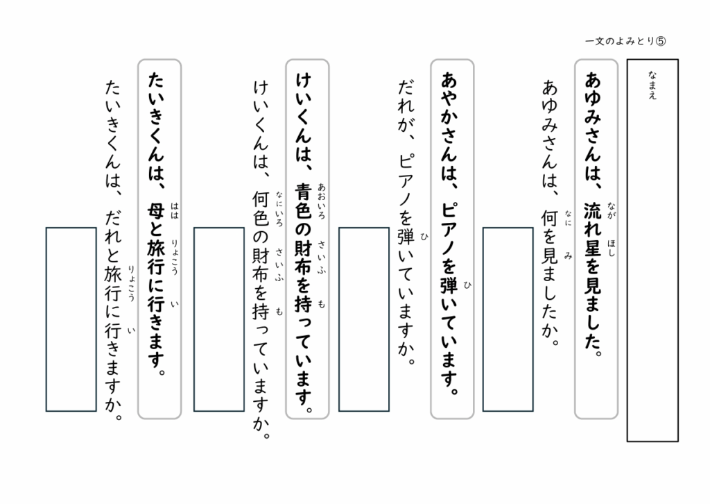 全て無料で使える文の読み取りプリントです(各5枚)