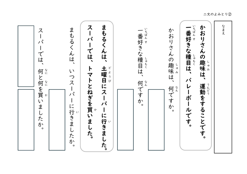 一文または二文から成る短い文章を読み、簡単な質問に答える形式のプリントです。