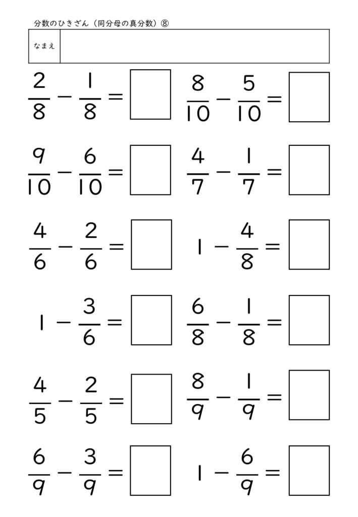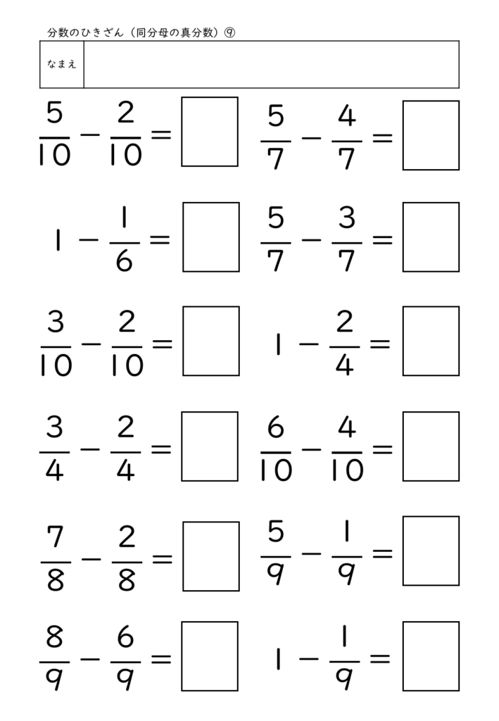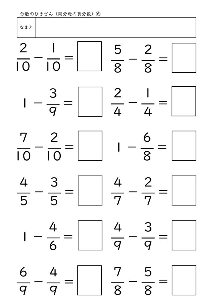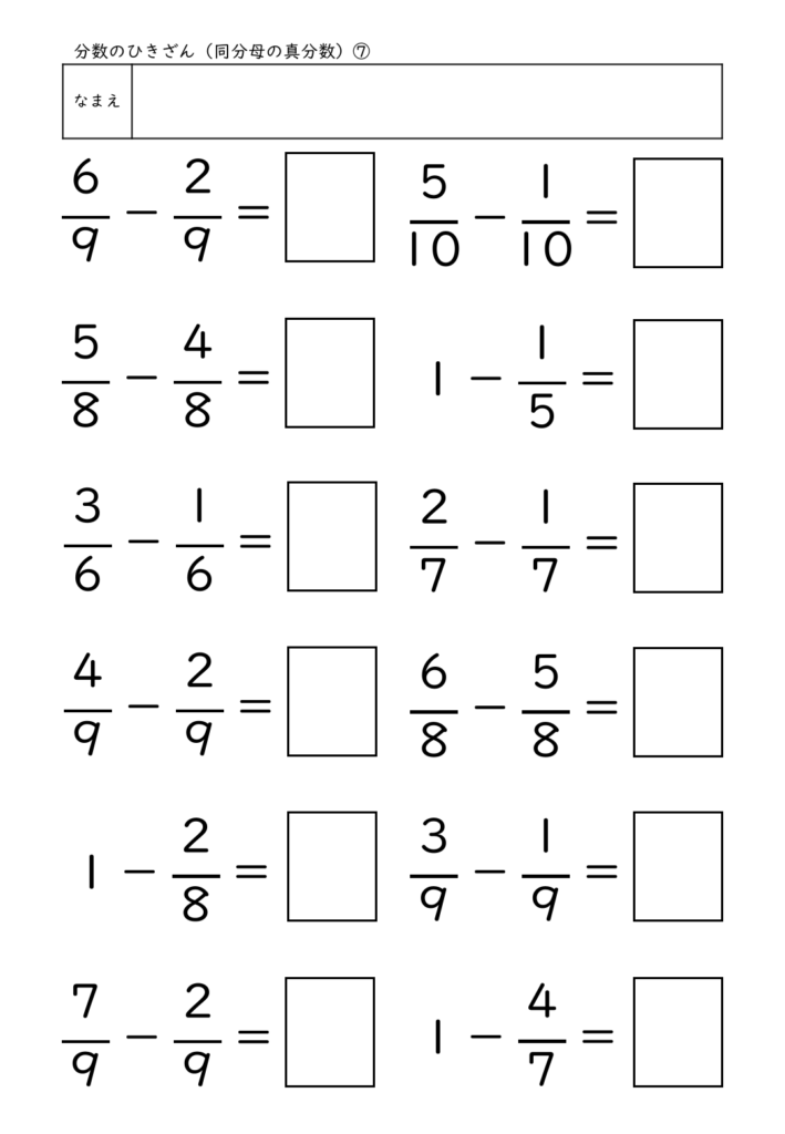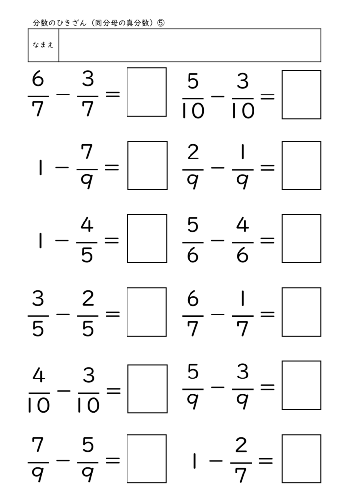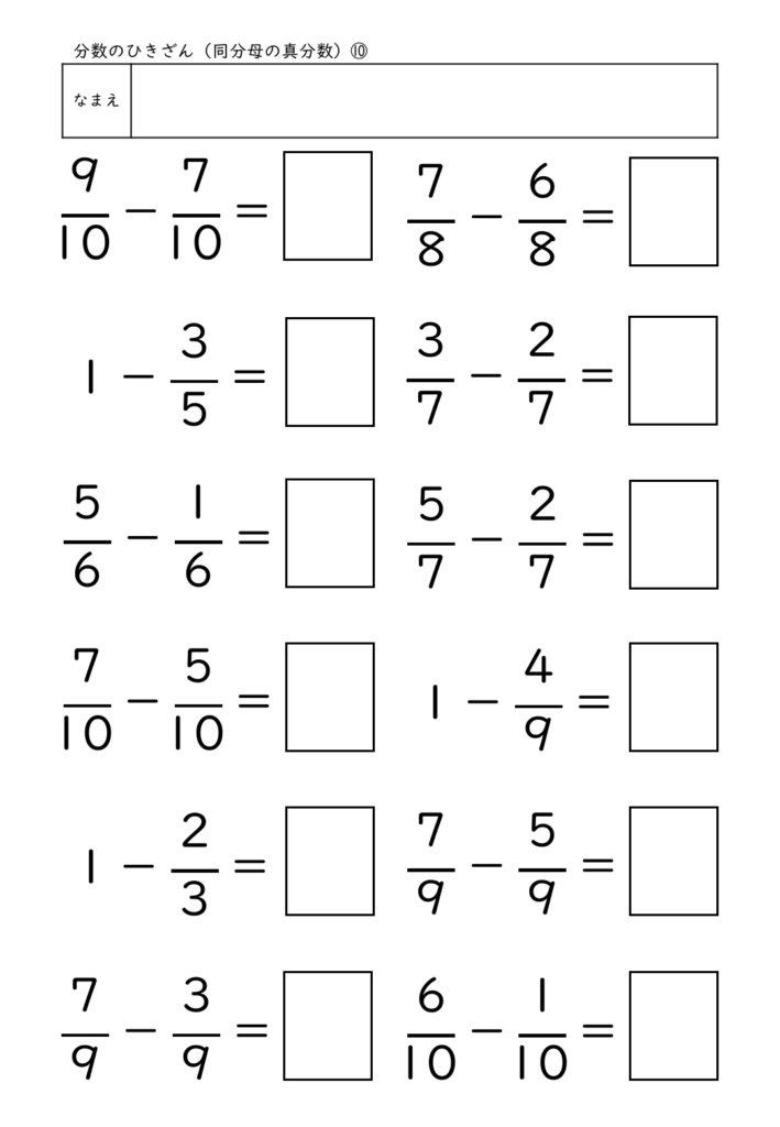 このプリントは、同分母の分数のひき算に特化して構成され、最も基本となる「単位のそろえ」と「分子を引く」流れを繰り返し練習できます。特に、1−3/10 のような“1からひく”問題を混ぜている点が特徴で、1を分数に直して考えるという概念理解を深めることができます。答えを書く欄には枠がついており、分母・分子を正しく配置して書く習慣づけが可能です。計算問題のみで構成されているため、練習量を確保しやすく、家庭学習にも個別学習にも使いやすいプリントです。