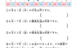 プリントの上半分には、ひと月分のカレンダーがあり、実際には存在しない架空の予定が書き込まれています。設問分も含めて、漢字には全て振り仮名が付いているため、低学年のお子さんでも安心して取り組むことができます。設問は、「土曜日は何回ありますか?」「31日には何の予定がありますか?」のように、カレンダーの中から必要な情報を探し出す形式になっています。特定の日付を探したり、予定を読み取ったりする練習ができます。1枚で4問に取り組める構成になっており、カレンダーの読み取りに慣れていないお子さんでも、徐々に理解が深まるよう工夫しています。