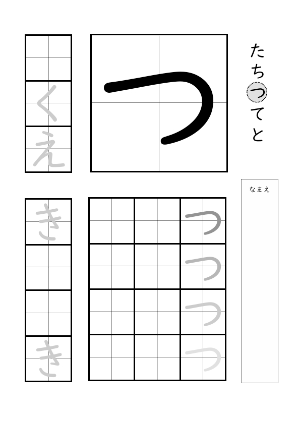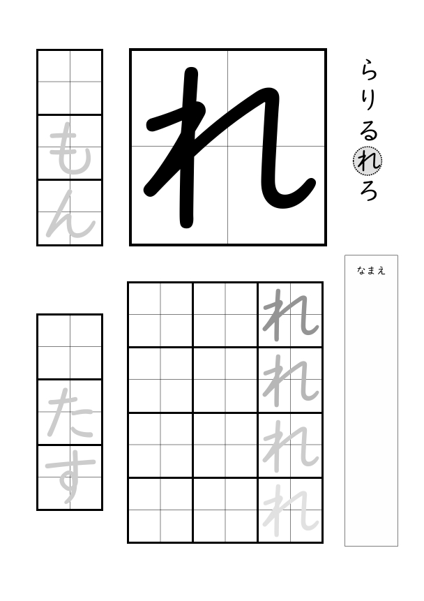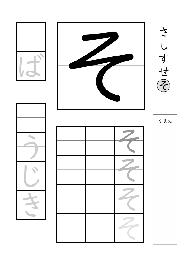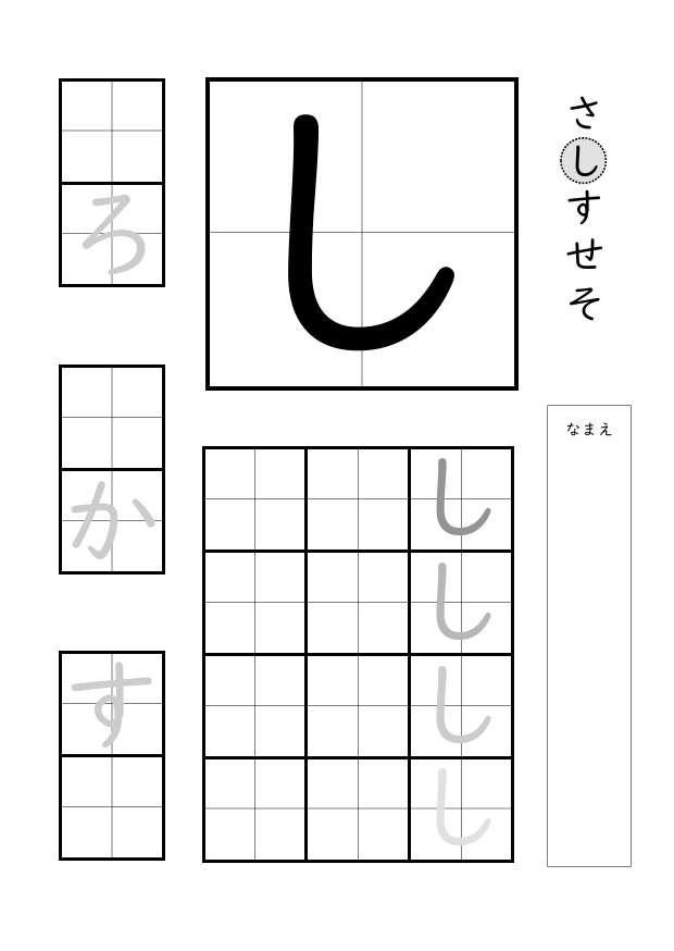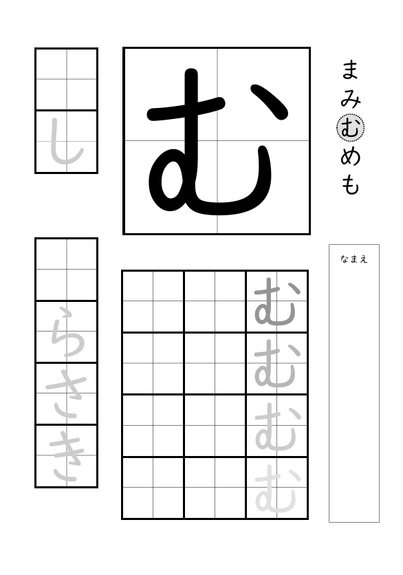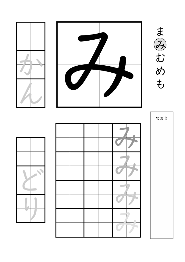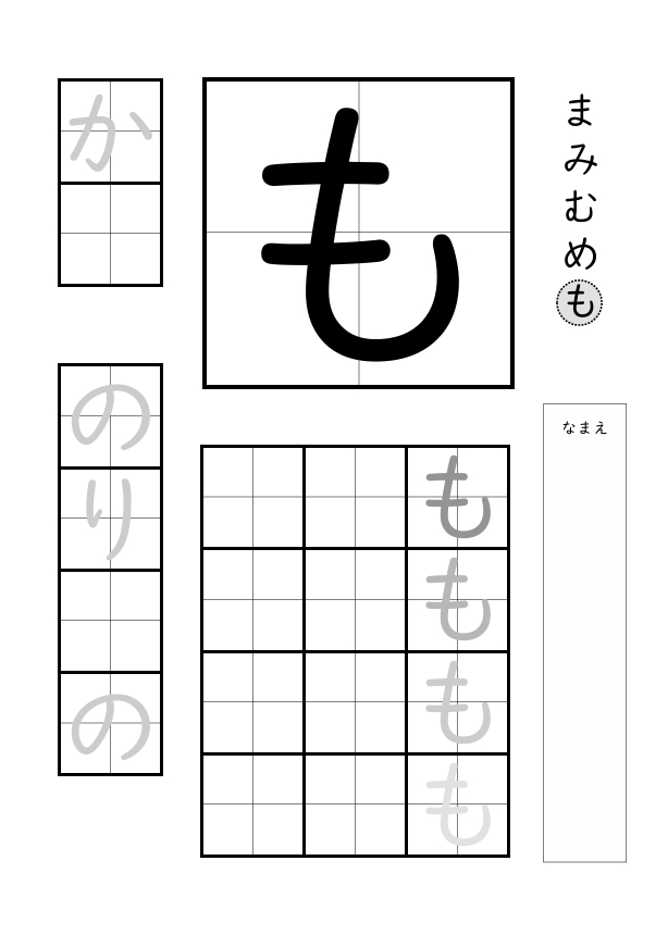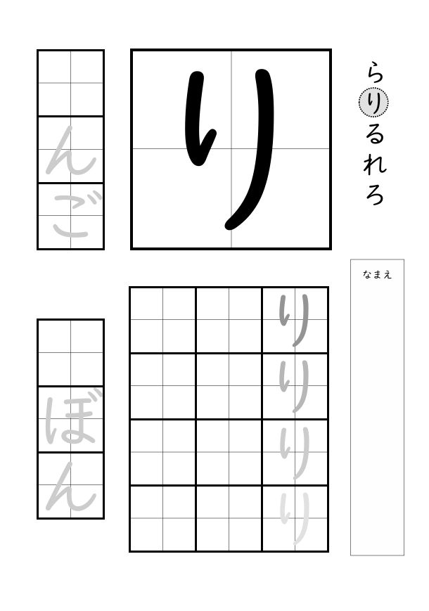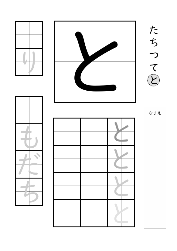 ■プリントの特徴1枚につき1文字の練習ができ、大きな見本文字と、なぞり線つきの練習マスが4マスあります。