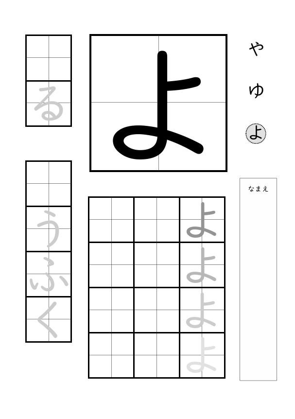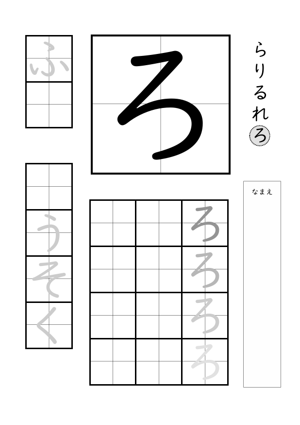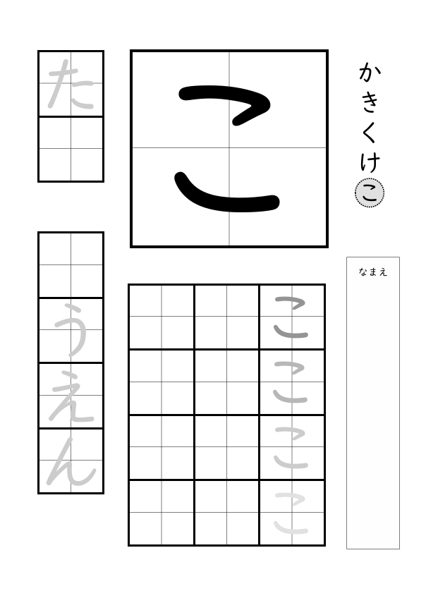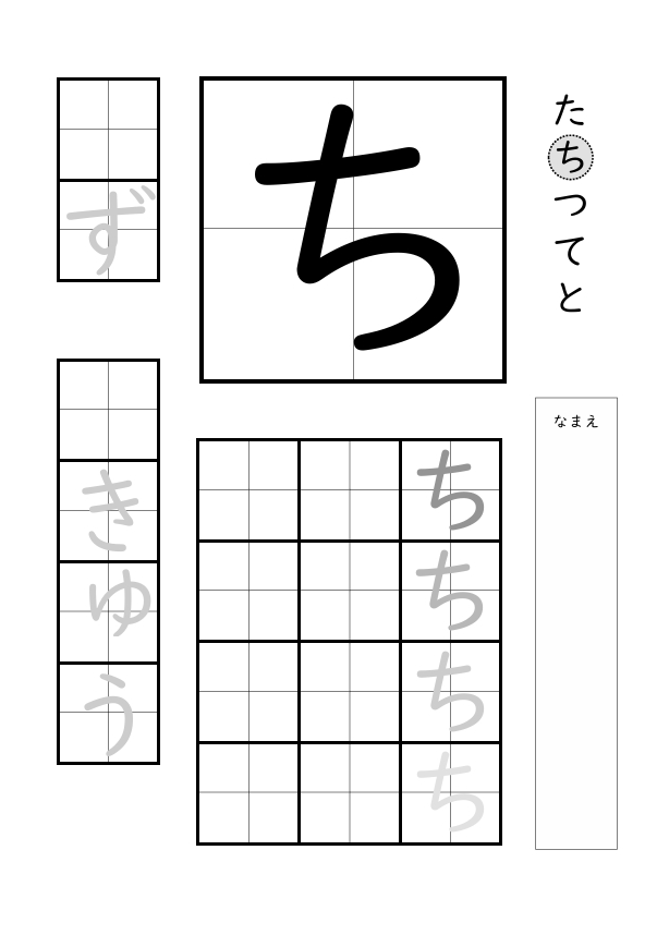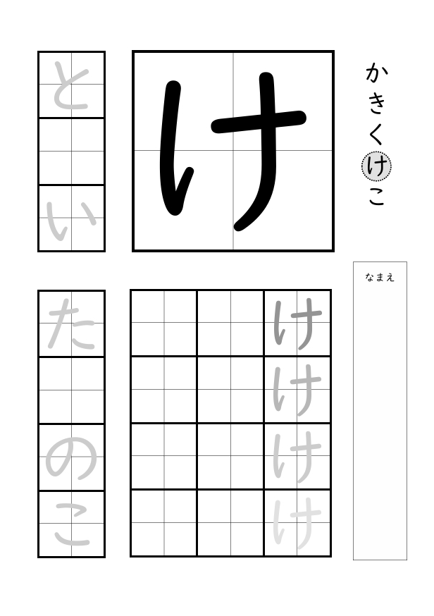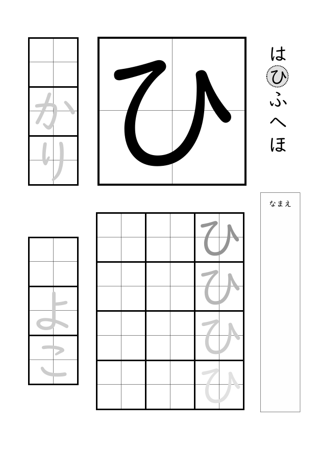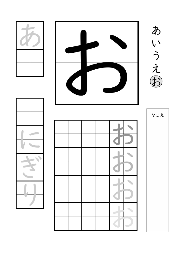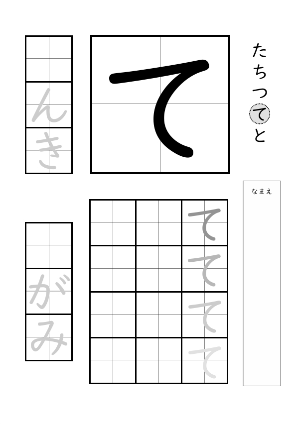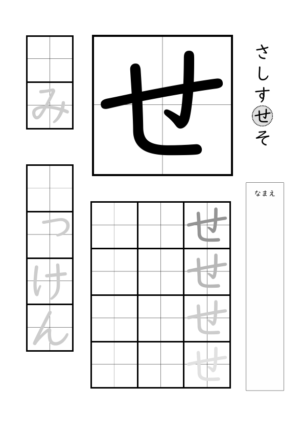 ■プリントの特徴1枚につき1文字の練習ができ、大きな見本文字と、なぞり線つきの練習マスが4マスあります。