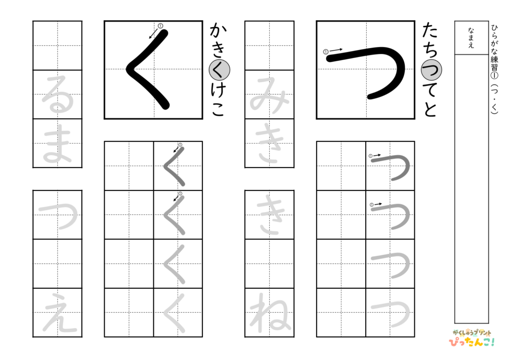 このプリントは、ひらがなの正しい形を身につけ、書くことに親しみをもつことをねらいとしています。小学校1年生の国語で学ぶ文字指導の基礎として、「見て・なぞって・書いて」定着させる流れを大切にしています。一文字ずつ丁寧に練習することで、読む力・書く力の両方の土台を育てます。
