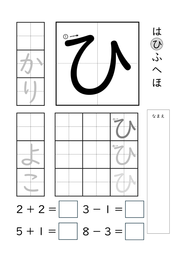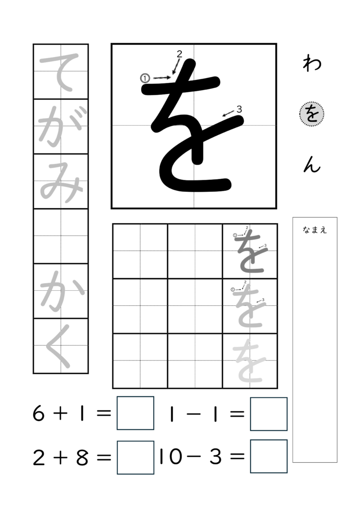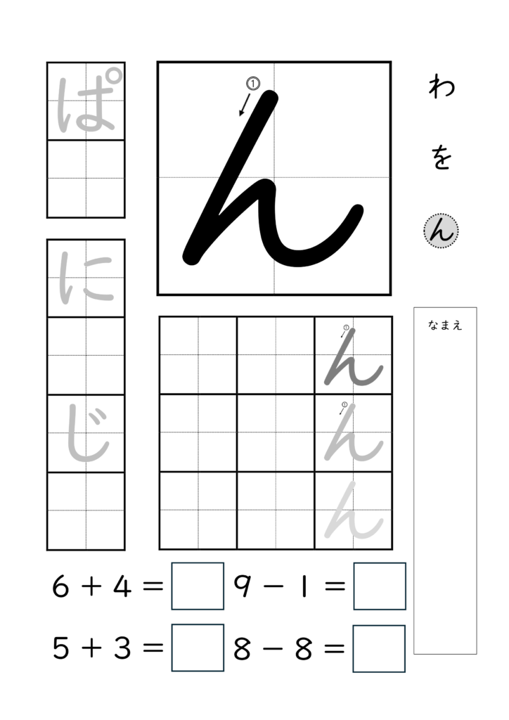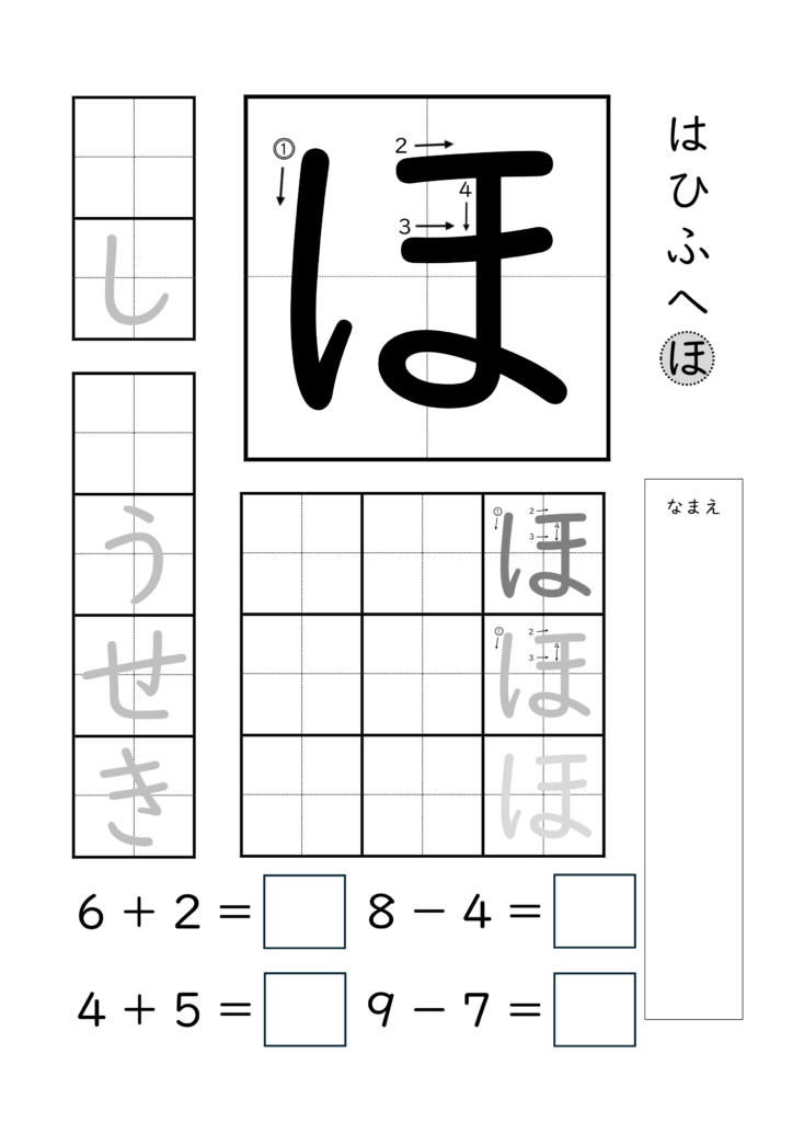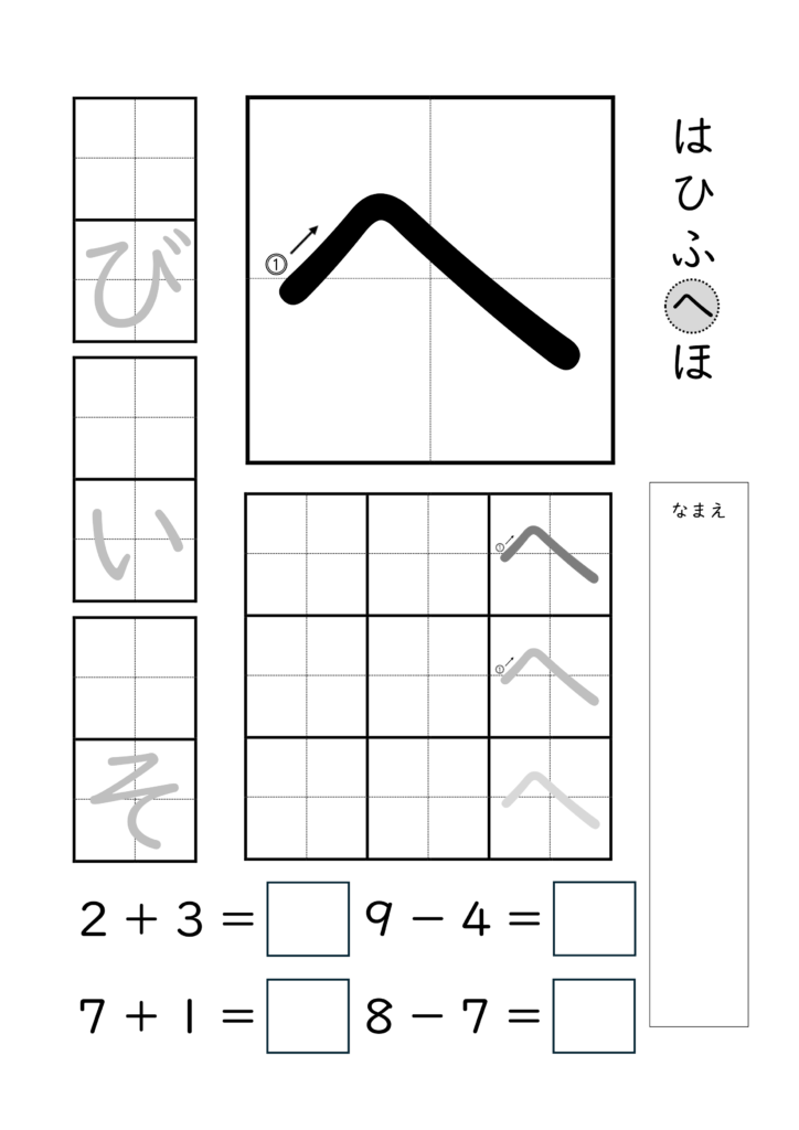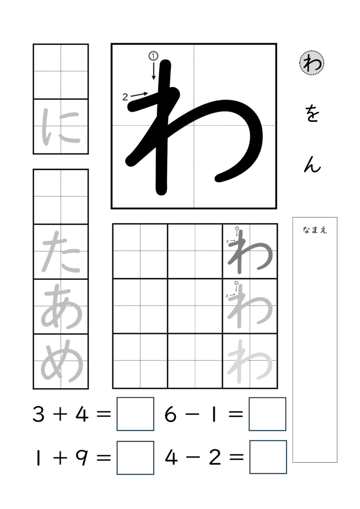 ひらがな練習(なぞり線/書き順)×たし算ひき算(繰り上がり繰り下がりなし)