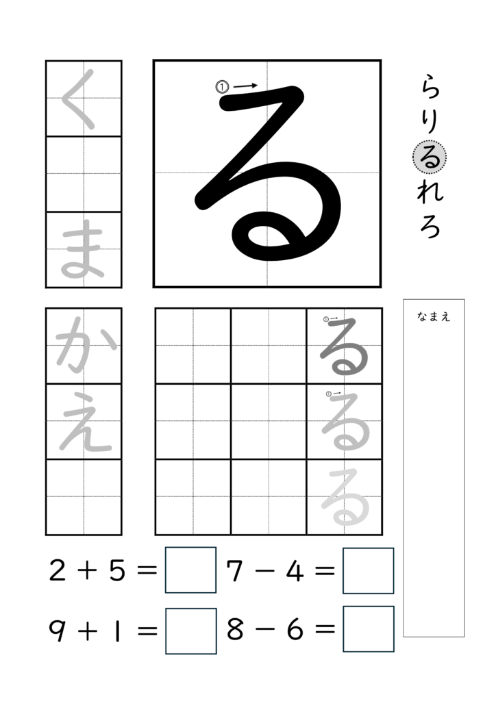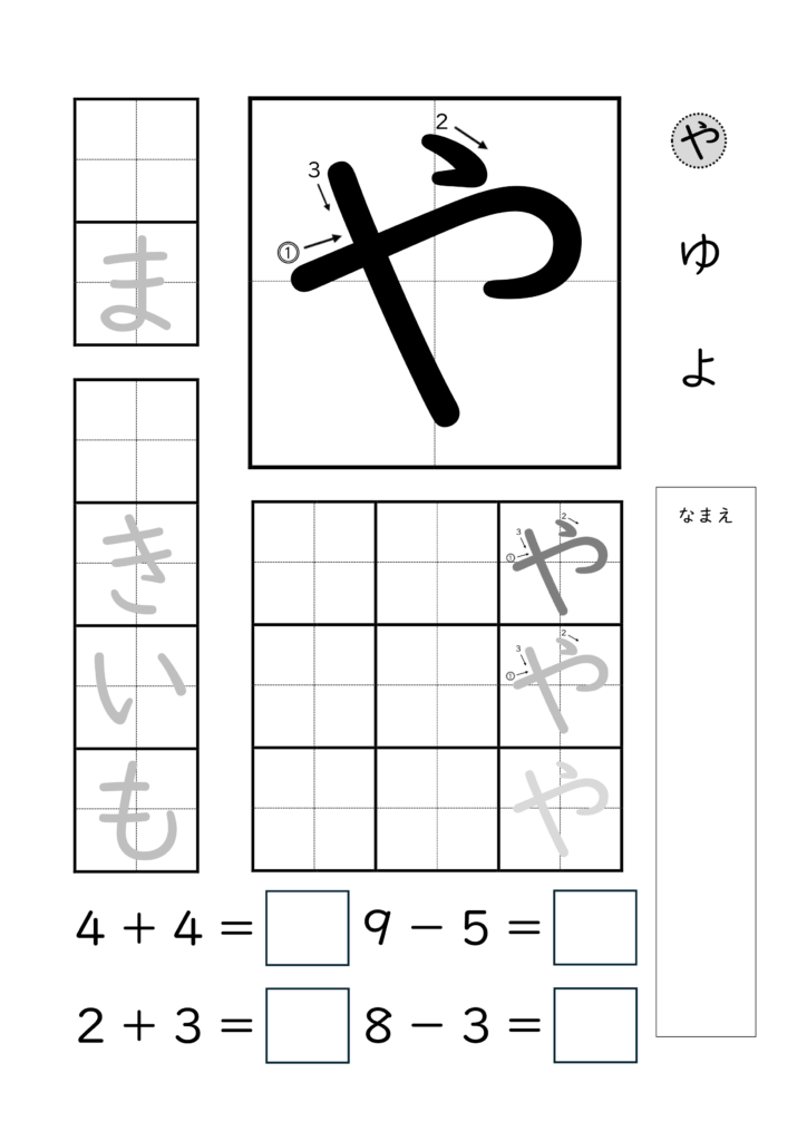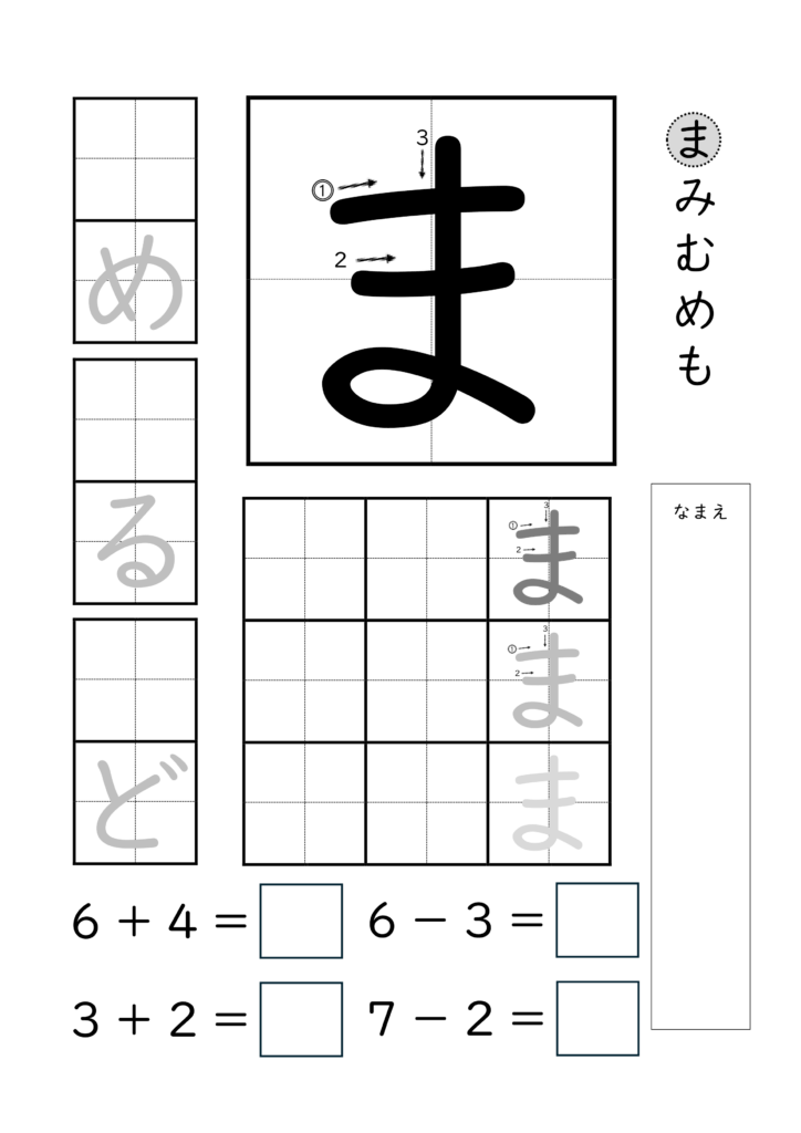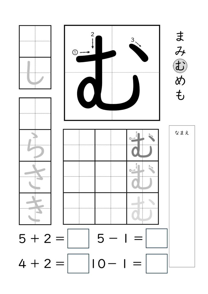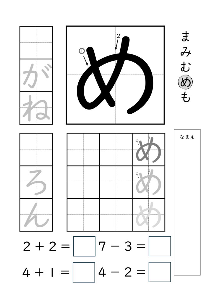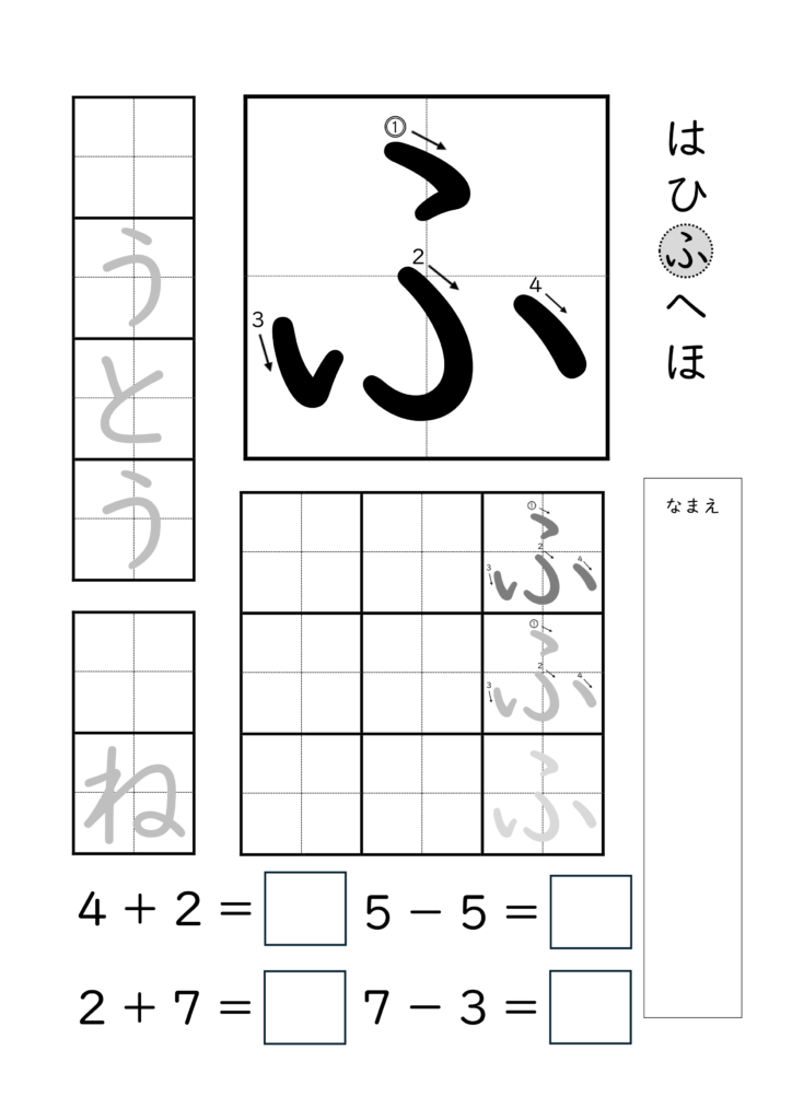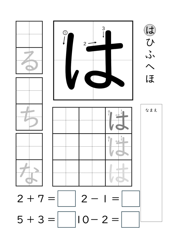 ひらがな練習(なぞり線/書き順)×たし算ひき算(繰り上がり繰り下がりなし)