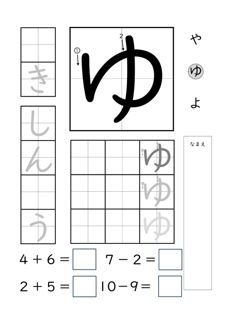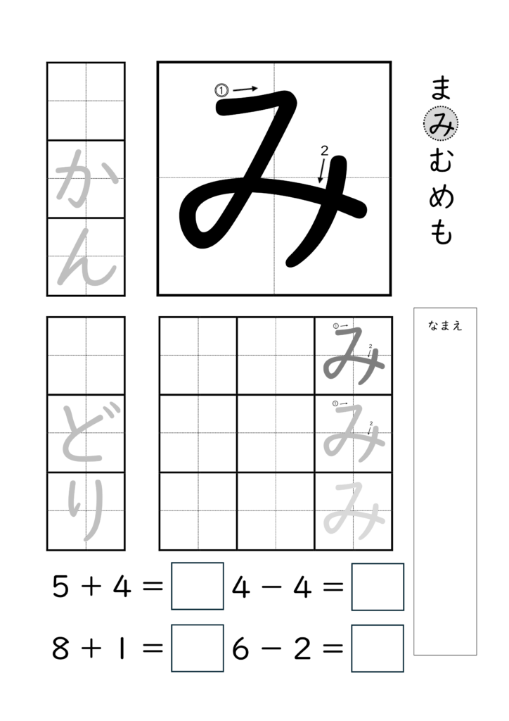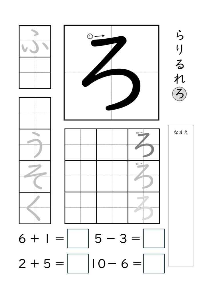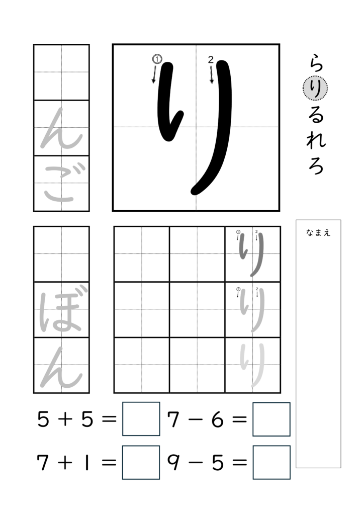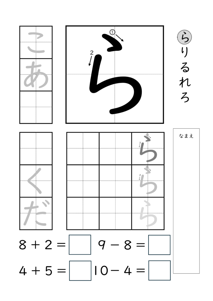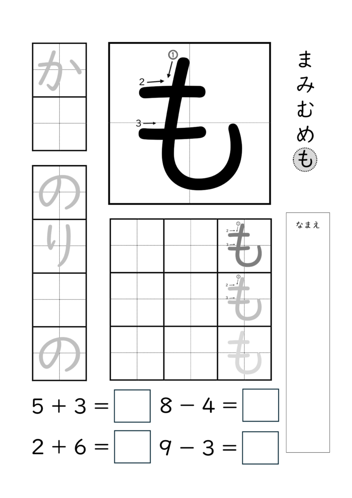 ひらがな練習(なぞり線/書き順)×たし算ひき算(繰り上がり繰り下がりなし)