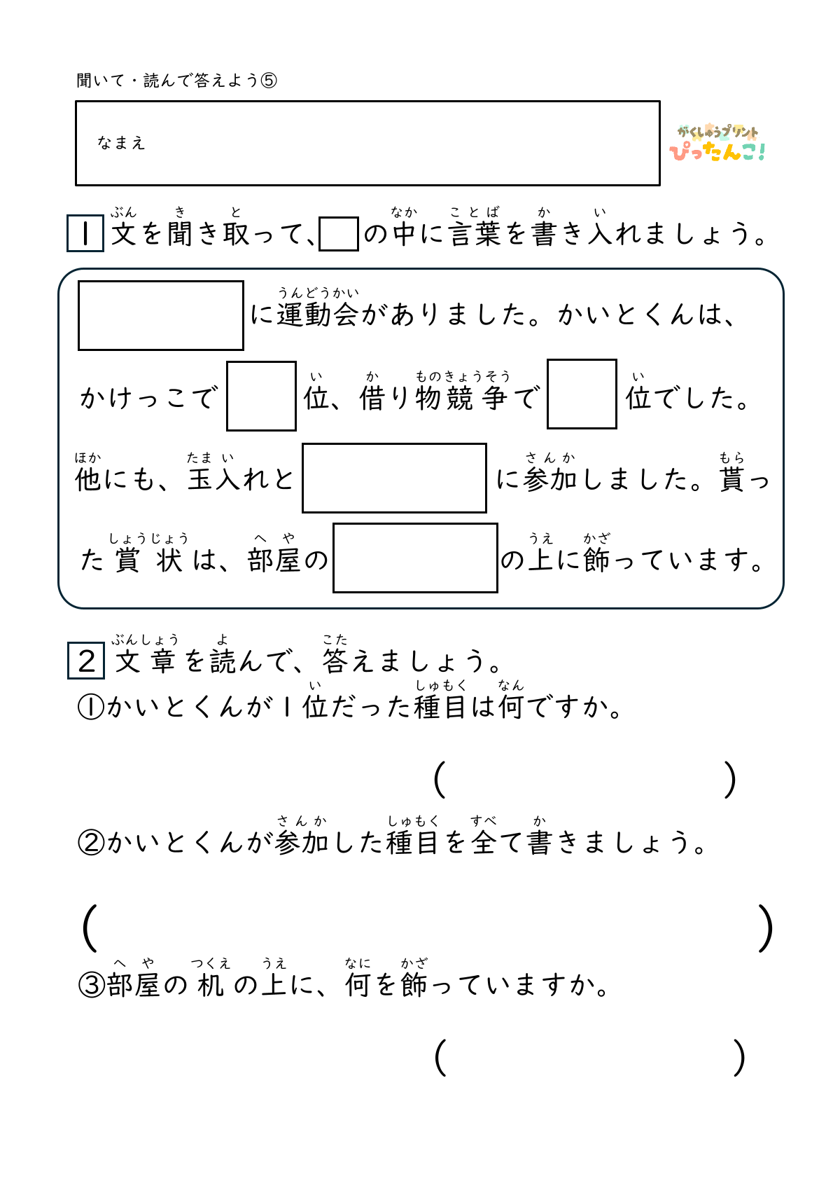 聞きとりと読み取りの力を同時に育てる国語プリントです。2枚1組で構成され、指導者が文章を読み上げ、子どもが聞いた言葉を穴あき部分に書き入れて文章を完成させます。文章は聞き取るポイントが分かりやすく、一文ずつ無理のない長さです。完成後は自分で文章を読み、質問に答えることで内容理解を確認します。聞く・書く・読む・考える活動を一つにつなげ、集中力や見通しをもって学習する力など、国語学習の土台を育てるプリントです。