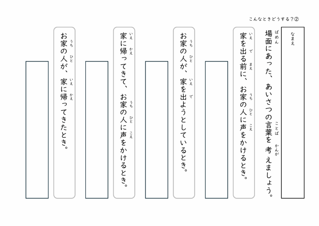 「朝、友達に会ったとき」「家を出るとき」など、具体的な状況を通して、相手の立場や気持ちを考えて言葉を選ぶ力を身につけます。