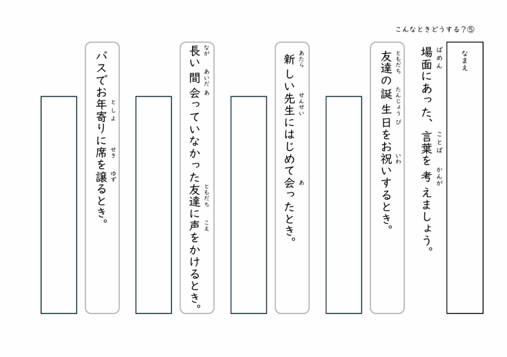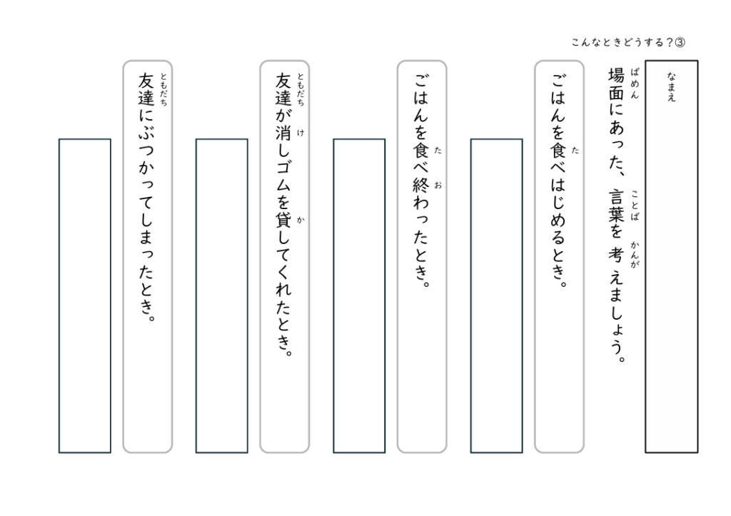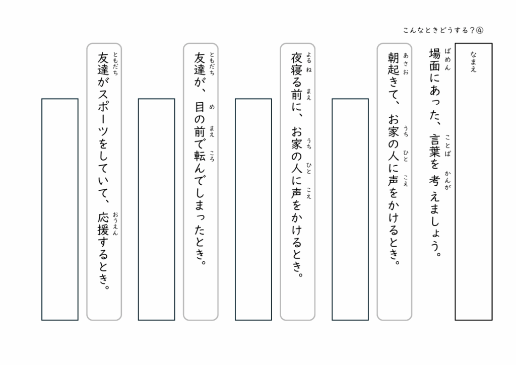 場面を思い浮かべながら言葉を選ぶことで、人との関わりを大切にする気持ちや、言葉で伝える力を育てるプリントです。
