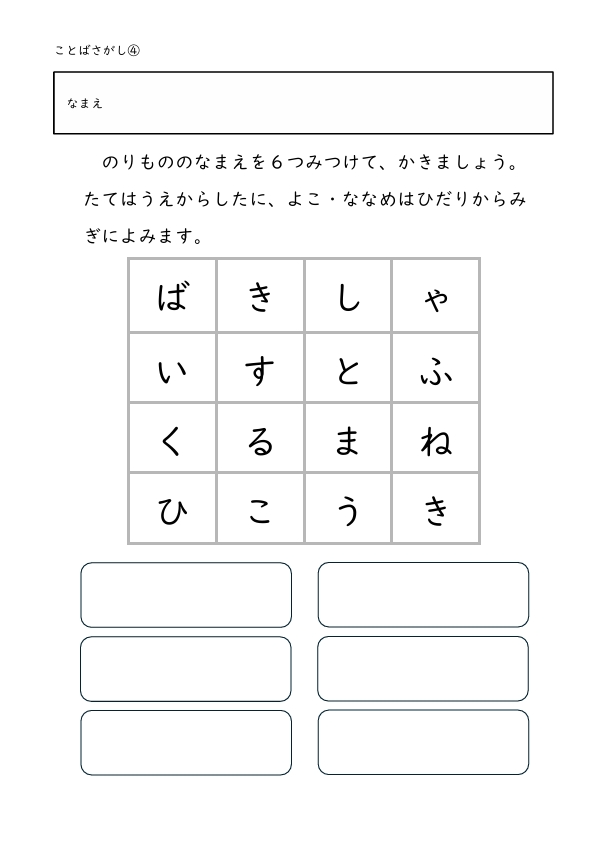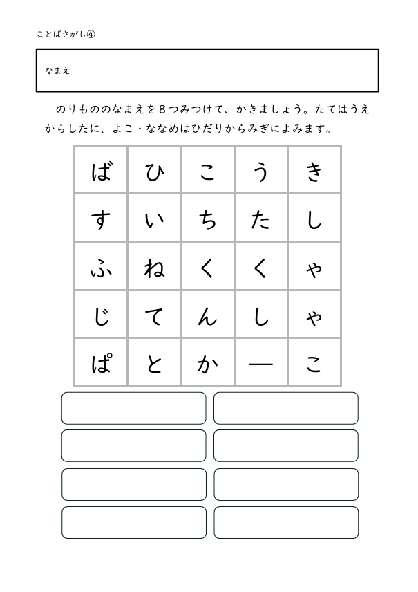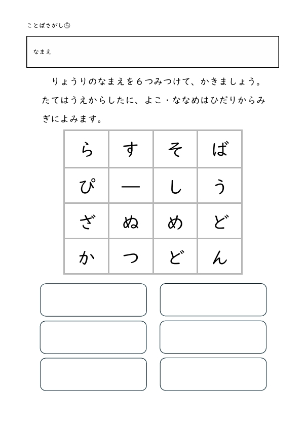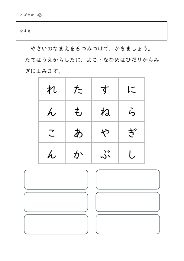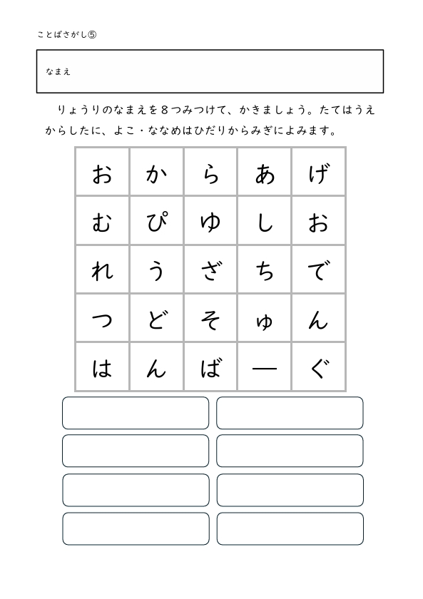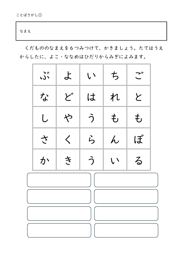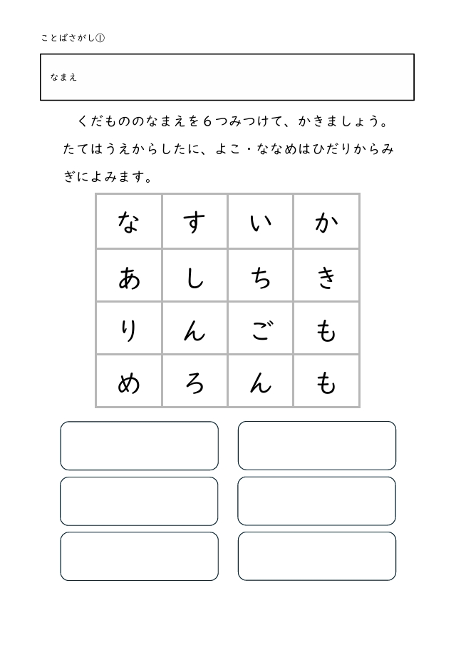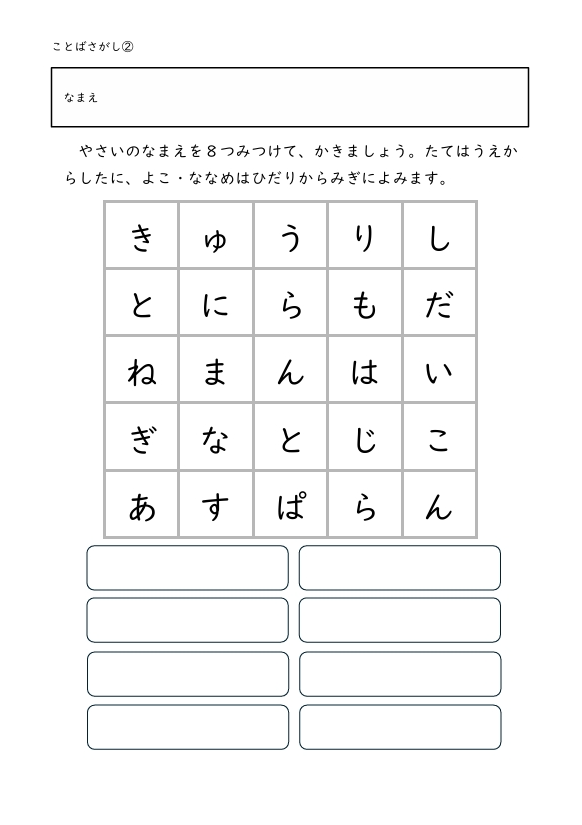 4×4 のマス目から6つの言葉を探すバージョン(かんたん)と、5×5 のマス目から8つの言葉を探すバージョン(ふつう)の2種類があり、お子さんの力に合わせて段階的に取り組めます。マスにはひらがなが1文字ずつ入っており、縦・横・斜めに並んだ文字を組み合わせて「くだもの」「やさい」「どうぶつ」「のりもの」「りょうり」など、生活の中で身近な言葉を探していきます。見つける楽しさを味わいながら、語彙やひらがなへの興味を自然に広げられる構成です。また、見つけた言葉を書き写す欄もあるため、「ひらがなを書くのが苦手」「まだ書き始め」のお子さんでも、見本を見ながら安心して取り組むことができます。書字練習にもつながるため、読み書きの土台を広く支えるプリントです。