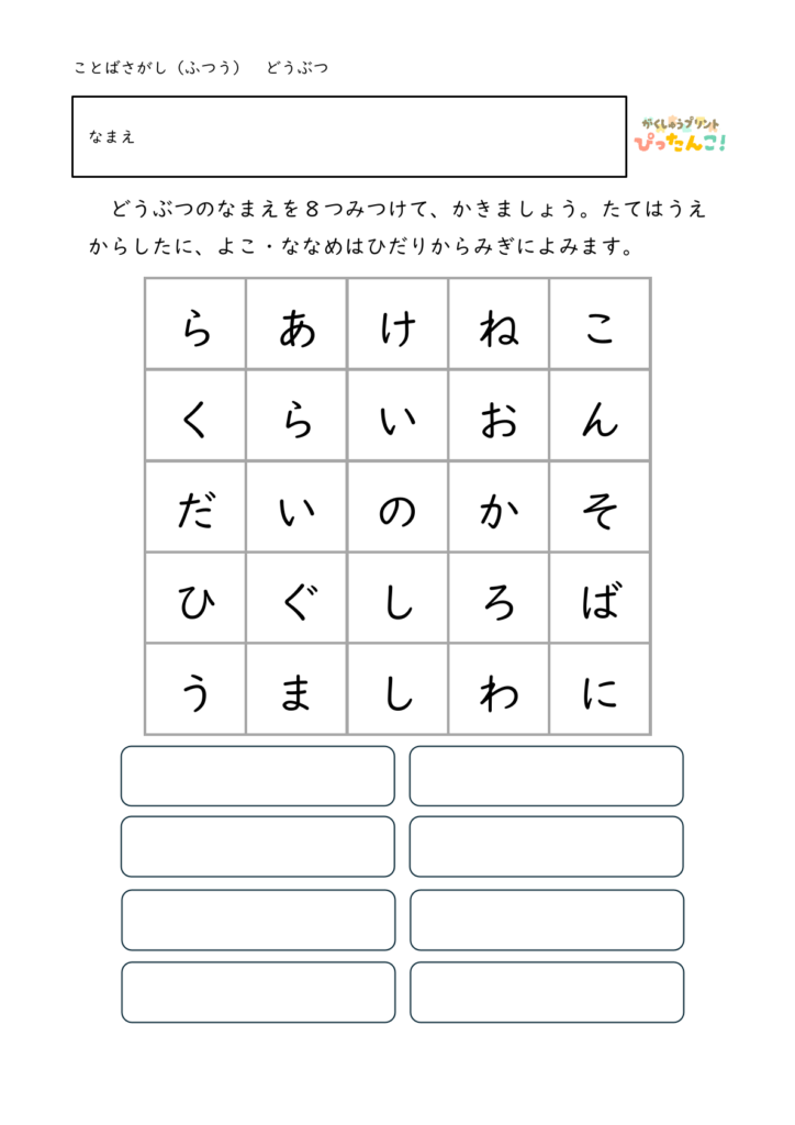 このプリントは、ひらがなをまとまりで捉える力を育てる教材です。マス目に並んだ文字から、縦・横・斜めの方向に意味のある言葉を探していきます。4×4で6つの言葉を探す「かんたん」と、5×5で8つの言葉を探す「ふつう」、6×7で8つの言葉を探す「むずかしい」があり、お子さんの学習段階に合わせて活用できます。身近な「くだもの」「やさい」「どうぶつ」などを扱っているため、ひらがなを覚えたてのお子さんでも取り組みやすく、見つけた言葉を書き写すことで書字練習にもつながります。教室や家庭学習で使いやすく、語彙の拡大、視知覚スキル、読み書きの基礎がバランスよく育つプリントです。