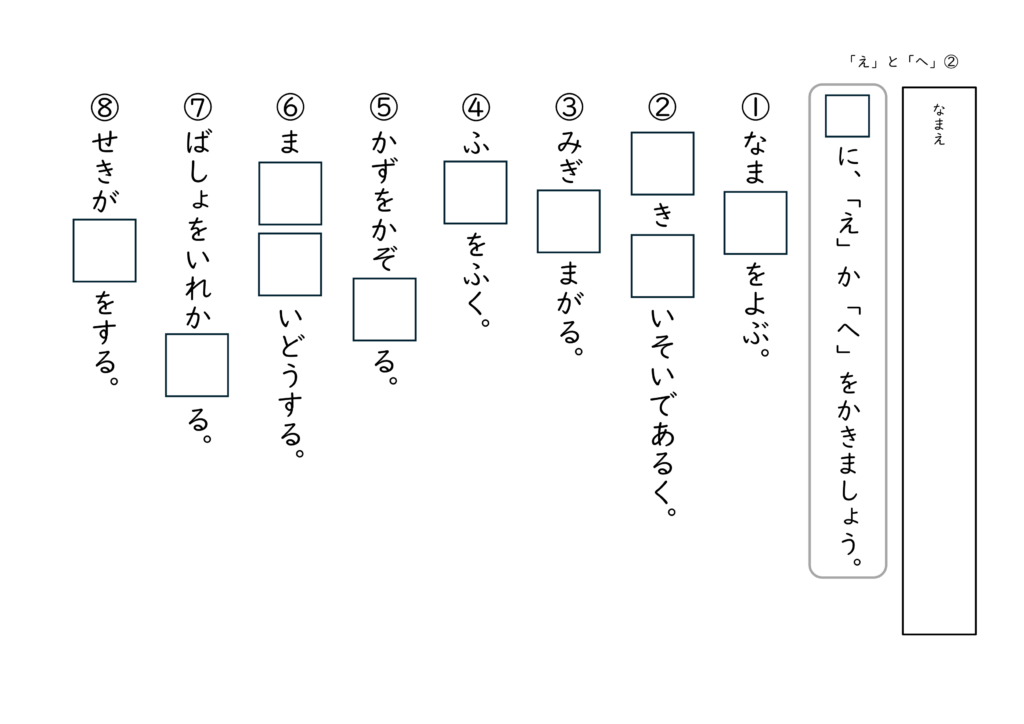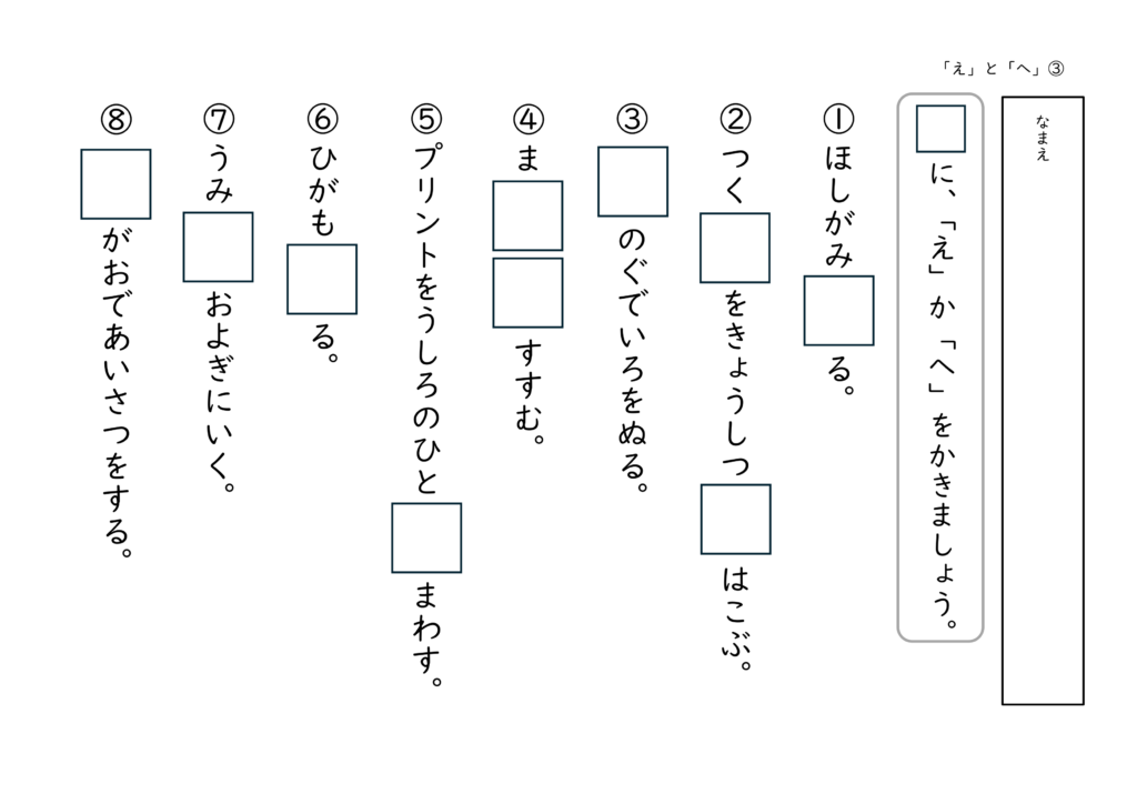 プリントは「くっつきの『は』」「くっつきの『を』」「くっつきの『へ』」の3種類に分かれており、それぞれのプリントでは、短い文章の中に助詞と同じ音の言葉を混在させています。たとえば「は/わ」のプリントでは、「私は いぬを かわ(?)ています。」のように、助詞の部分が空欄になっており、文の内容を読んで適切な助詞を判断します。助詞ではない「わ」「お」「え」も文中に登場するため、音だけで判断できず、意味を理解して選ばなければいけない構造になっています。すべてひらがなの文章なので、学年を問わず取り組みやすいのも特長です。書き込む欄には枠があり、文字の大きさに気を配りながら丁寧に書くことができます。