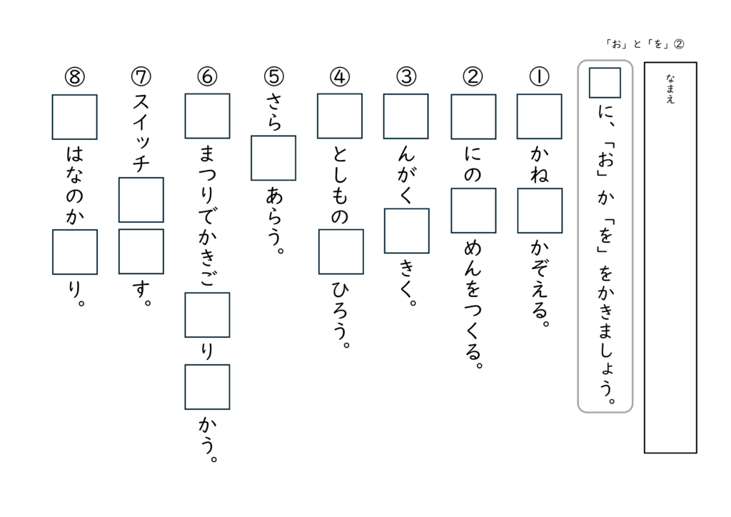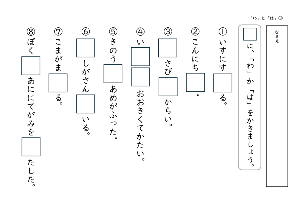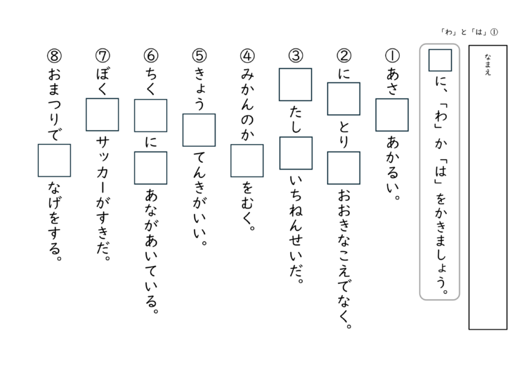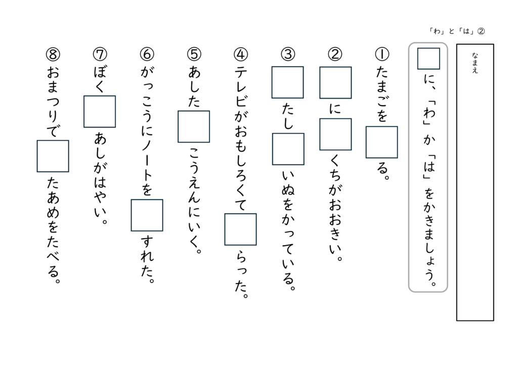 このプリントは、文中で使われる助詞の 「は・わ」「を・お」「へ・え」 の使い分けを学ぶための教材です。特に小学校低学年の子どもたちは、ひらがなとしては読めていても、「文の中で助詞は特殊な読みをする」という日本語特有のルールを理解するのが難しいことが多くあります。「わ」と読むのに「は」と書く、「え」と読むのに「へ」と書くという例外は、音だけを頼りに書いてしまうと間違いが定着してしまいがちです。このプリントでは、簡単で意味の取りやすい短文の中に空欄を設け、文脈から正しい助詞を選んで書く練習を通して、正しく使い分ける力を育てることを目的としています。文の流れの中で助詞の役割を意識しながら取り組めるため、読み書きの基礎となる文法感覚の育成につながります。