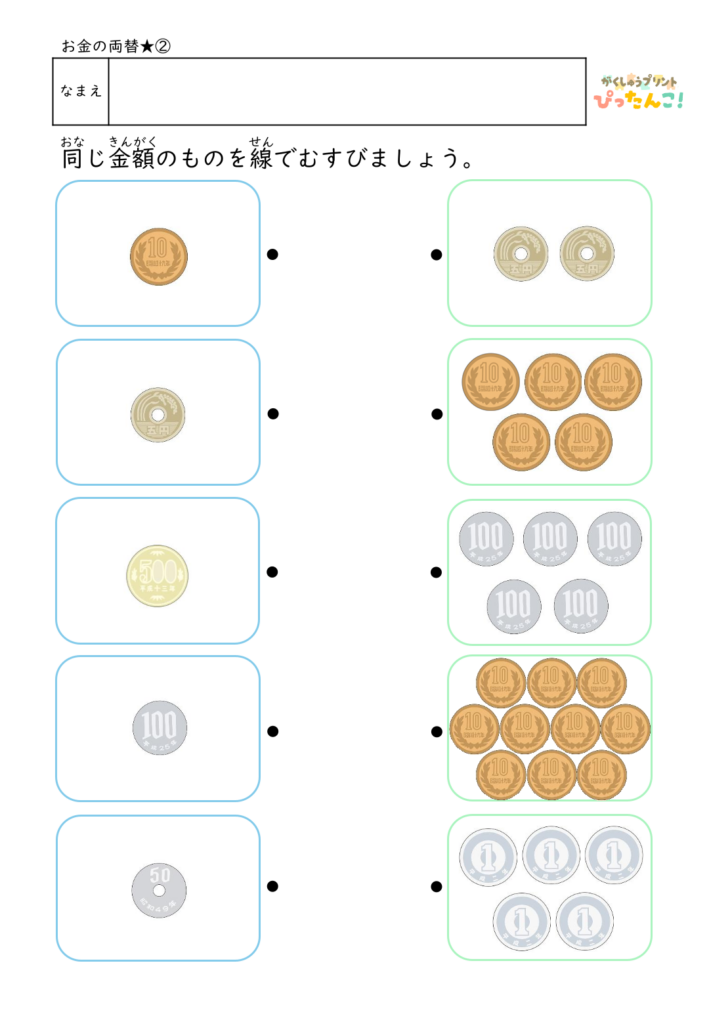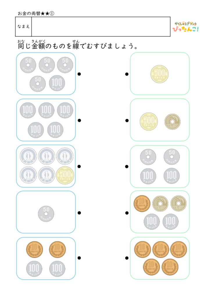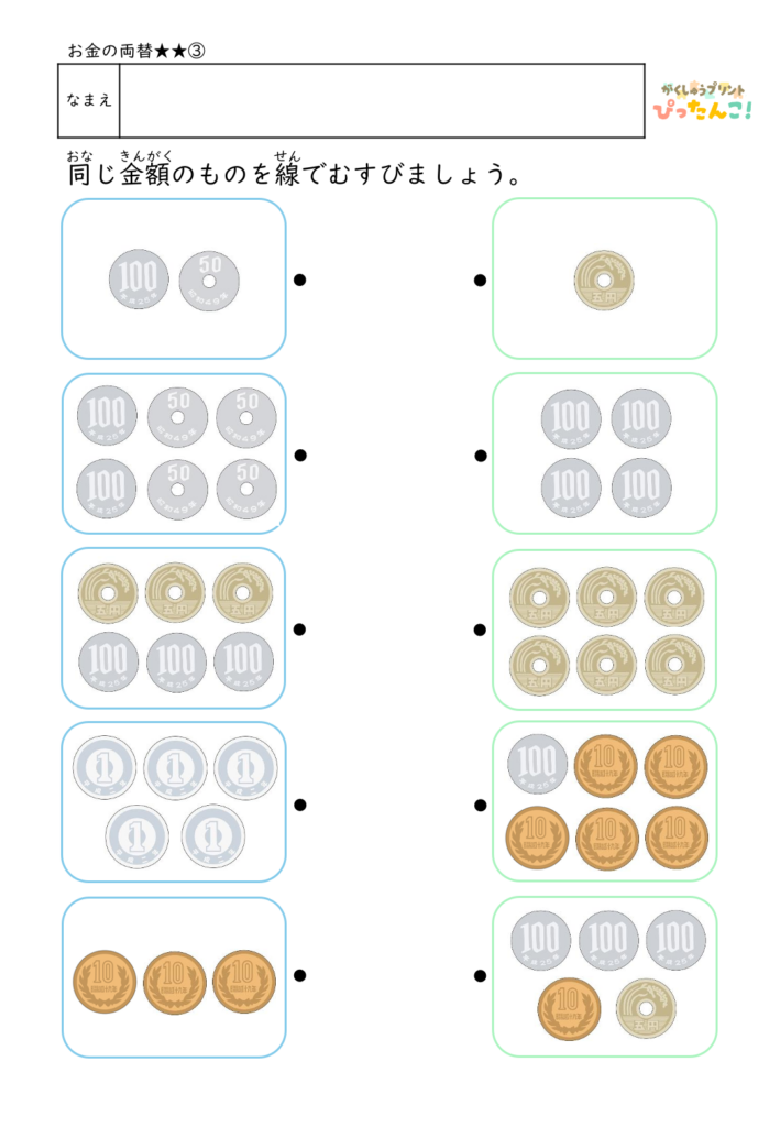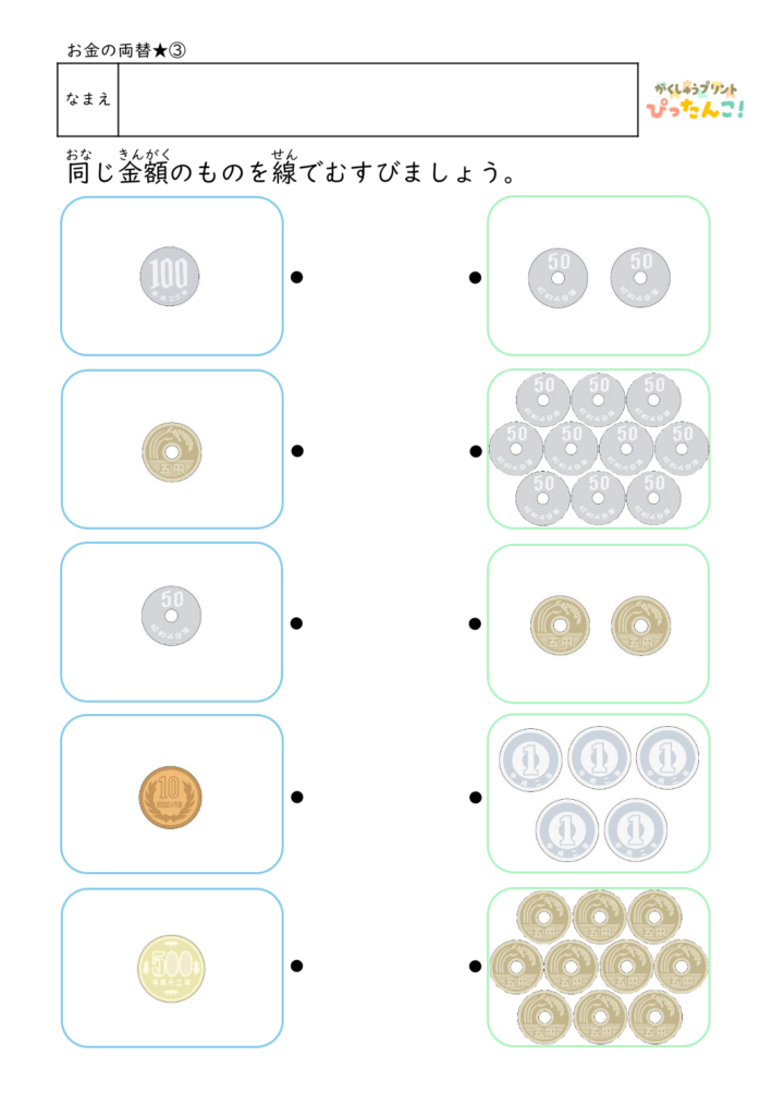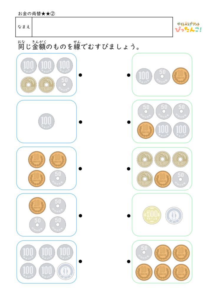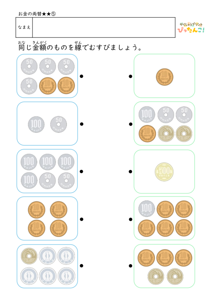このプリントは、お金の価値や構成を理解し、「同じ金額でも表し方が違う」ことに気づくことをねらいとしています。小学校低学年では、硬貨の種類や金額は分かっていても、両替となると混乱してしまうお子さんも少なくありません。このプリントでは、500円玉・100円玉・50円玉・10円玉・5円玉といった硬貨を具体的なイラストで確認しながら、金額が等しい組み合わせを結ぶことで、金額の関係性を視覚的に理解できるようにしています。計算だけに頼らず、「いくつ集まると同じ金額になるのか」を考える力を育てることが目的です。