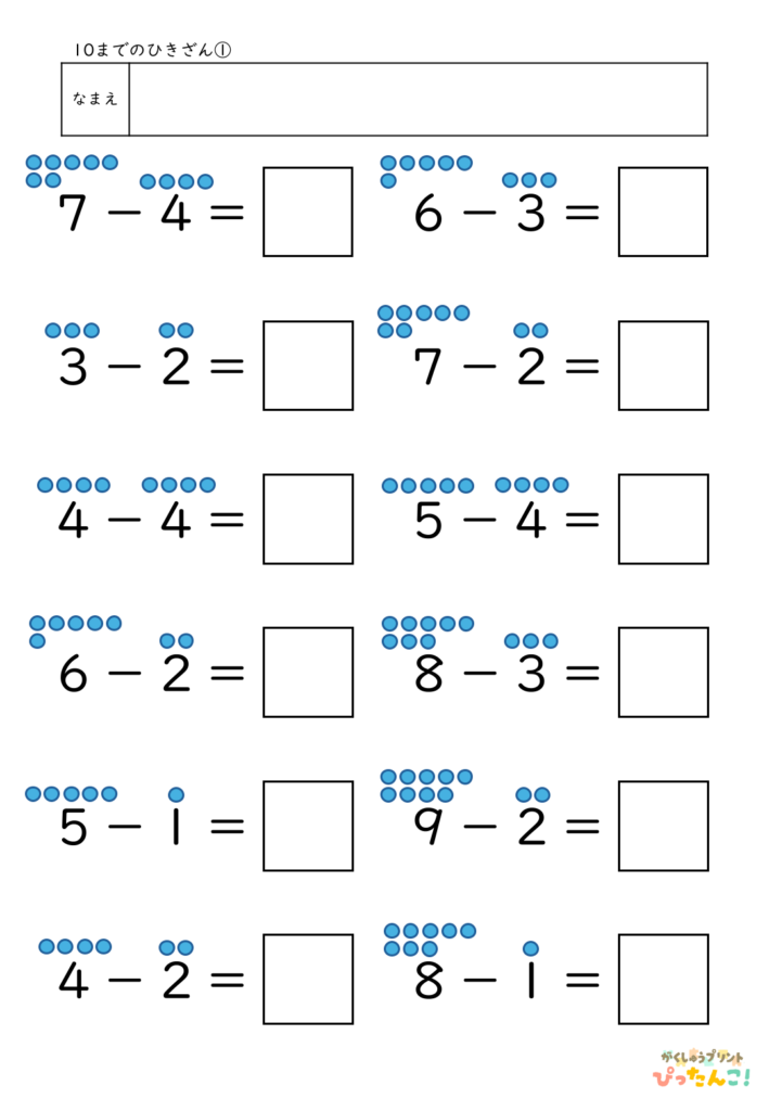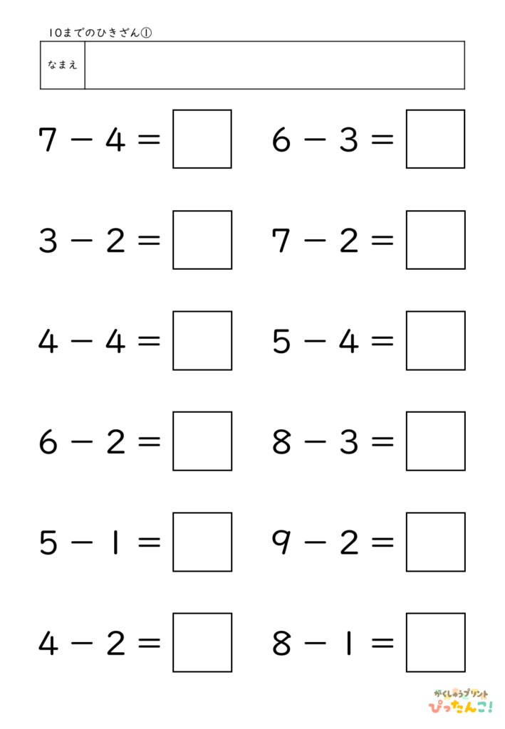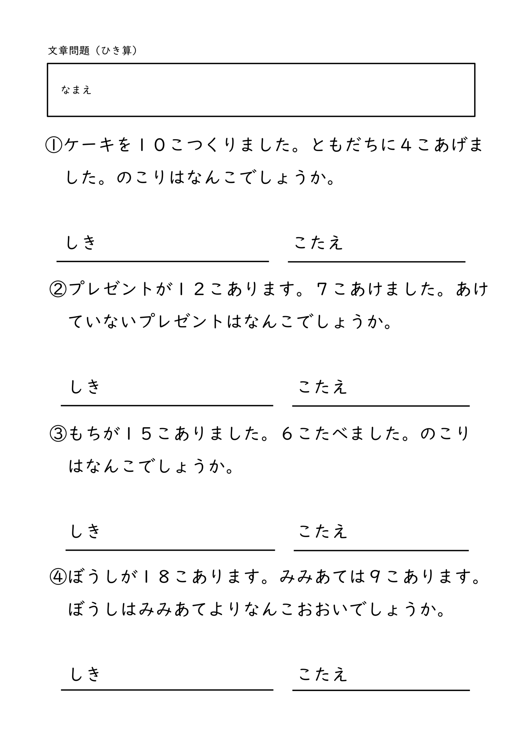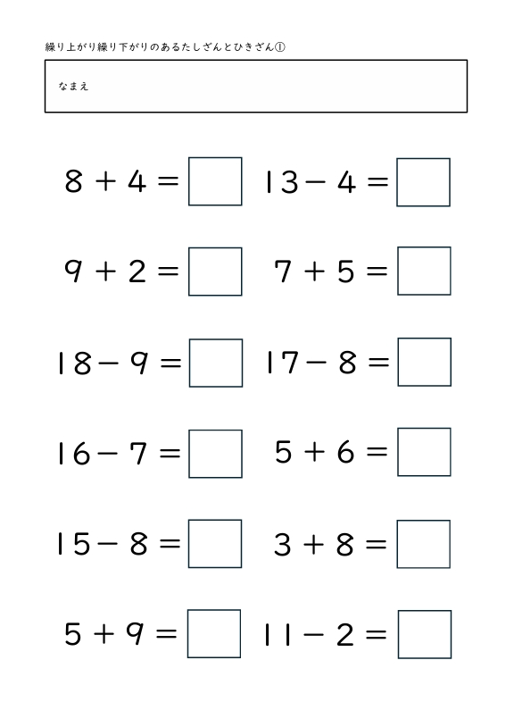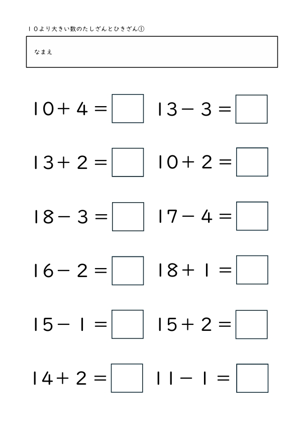算数│小学校1年生 2026.03.222026.04.02 算数TOP >小学校1年生 内容を選ぶ 内容から探す たし算 5までの数のたし算 5問(全10枚) 5問/補助あり(全10枚) 10までの数のたし算 5問(全10枚) 8問(全10枚) 8問/補助あり(全10枚) 12問(全10枚) 12問/補助あり(全10枚) 8問/穴埋め(全10枚) たし算とひき算/12問(全10枚) 繰り上がりのあるたし算 12問(全10枚) たし算とひき算/12問(全10枚) 10より大きい数のたし算 12問(全10枚) たし算とひき算12問(全10枚) 大きい数のたし算 何十+何十/12問(全10枚) 100までの数/12問(全10枚) 何十+何十と何十-何十/12問(全10枚) 100までの数のたし算とひき算/12問(全10枚) 3つの数のたし算 12問(全10枚) たし算とひき算/12問(全10枚) その他 3問/4問/5問/6問/8問/10問/12問/16問 ひき算 10までの数のひき算 8問(全10枚) 8問/補助あり(全10枚) 12問(全10枚) 12問/補助あり(全10枚) 8問/穴埋め(全10枚) たし算とひき算/12問(全10枚) 繰り下がりのあるひき算 12問(全10枚) たし算とひき算/12問(全10枚) 10より大きい数のひき算 12問(全10枚) たし算とひき算12問(全10枚) 大きい数のひき算 何十-何十/12問(全10枚) 100までの数/12問(全10枚) 何十+何十と何十-何十/12問(全10枚) 100までの数のたし算とひき算/12問(全10枚) 3つの数のひき算 12問(全10枚) たし算とひき算/12問(全10枚) その他 3問/4問/5問/6問/8問/10問/12問/16問 文章問題 たし算とひき算 10までの数/4問(全10枚) よく読む/10までの数/6問(全10枚) 数・数概念 10までの数 数字マッチング(全10枚) 大きな数 100未満の数/数え方(全5枚) 2位数の構成/10が〇こと1が〇こ(全10枚) 100までの数表/穴埋め10個(全10枚) 100までの数表/穴埋め20個(全5枚) 100までの数の順序(全10枚) 100より大きい数の順序や大小(全5枚) 時計・時刻 何時何分 何時のみ(全5枚) 30分刻み(全5枚) 15分刻み(全5枚) 10分刻み(全5枚) 5分刻み(全5枚) 1分刻み(全10枚) 1分刻み/5分目盛り(全10枚) その他 冬休みセット 冬休み応援セット(全10枚) 算数×国語 ひらがな×計算 カタカナ×計算 自分で作れる計算練習テンプレート たし算 ひき算