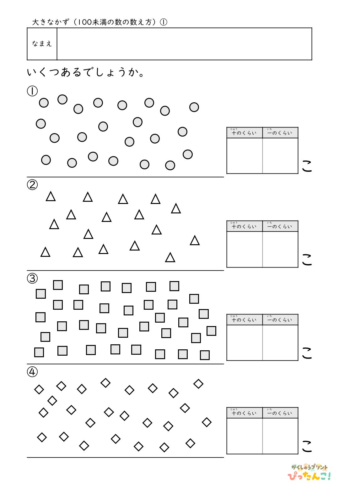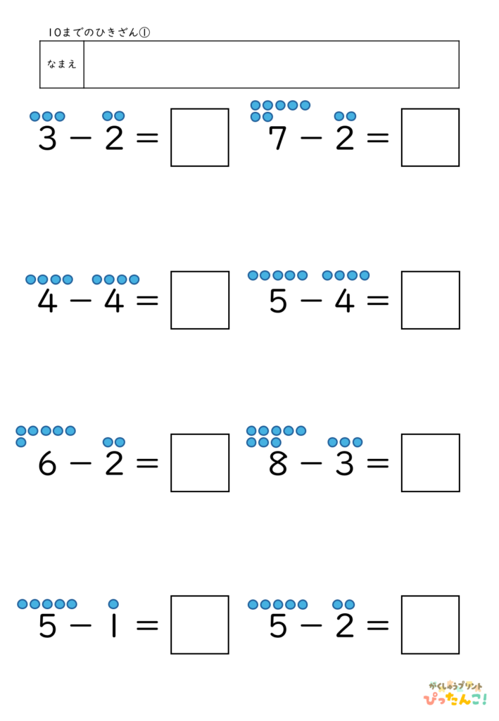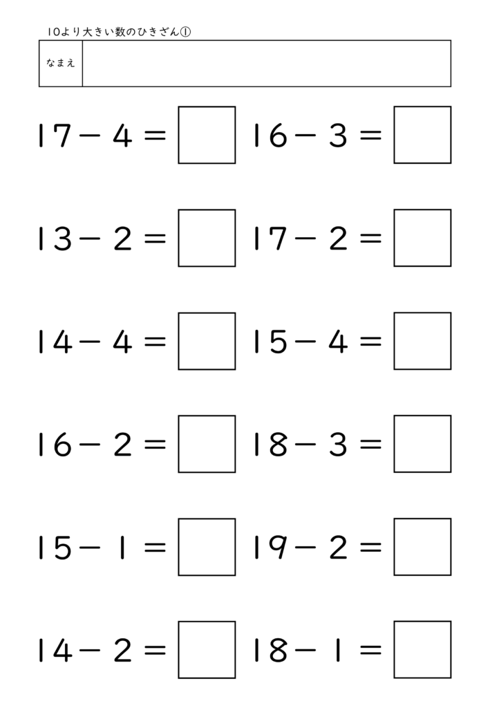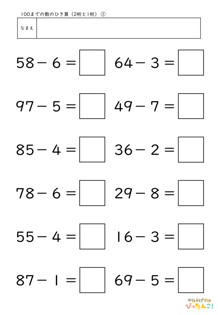 算数│小学校1年生 2026.03.222026.04.02 算数TOP >小学校1年生 内容を選ぶ 内容から探す たし算 5までの数のたし算 5問(全10枚) 5問/補助あり(全10枚) 10までの数のたし算 5問(全10枚) 8問(全10枚) 8問/補助あり(全10枚) 12問(全10枚) 12問/補助あり(全10枚) 8問/穴埋め(全10枚) たし算とひき算/12問(全10枚) 繰り上がりのあるたし算 12問(全10枚) たし算とひき算/12問(全10枚) 10より大きい数のたし算 12問(全10枚) たし算とひき算12問(全10枚) 大きい数のたし算 何十+何十/12問(全10枚) 100までの数/12問(全10枚) 何十+何十と何十-何十/12問(全10枚) 100までの数のたし算とひき算/12問(全10枚) 3つの数のたし算 12問(全10枚) たし算とひき算/12問(全10枚) その他 3問/4問/5問/6問/8問/10問/12問/16問 ひき算 10までの数のひき算 8問(全10枚) 8問/補助あり(全10枚) 12問(全10枚) 12問/補助あり(全10枚) 8問/穴埋め(全10枚) たし算とひき算/12問(全10枚) 繰り下がりのあるひき算 12問(全10枚) たし算とひき算/12問(全10枚) 10より大きい数のひき算 12問(全10枚) たし算とひき算12問(全10枚) 大きい数のひき算 何十-何十/12問(全10枚) 100までの数/12問(全10枚) 何十+何十と何十-何十/12問(全10枚) 100までの数のたし算とひき算/12問(全10枚) 3つの数のひき算 12問(全10枚) たし算とひき算/12問(全10枚) その他 3問/4問/5問/6問/8問/10問/12問/16問 文章問題 たし算とひき算 10までの数/4問(全10枚) よく読む/10までの数/6問(全10枚) 数・数概念 10までの数 数字マッチング(全10枚) 大きな数 100未満の数/数え方(全5枚) 2位数の構成/10が〇こと1が〇こ(全10枚) 100までの数表/穴埋め10個(全10枚) 100までの数表/穴埋め20個(全5枚) 100までの数の順序(全10枚) 100より大きい数の順序や大小(全5枚) 時計・時刻 何時何分 何時のみ(全5枚) 30分刻み(全5枚) 15分刻み(全5枚) 10分刻み(全5枚) 5分刻み(全5枚) 1分刻み(全10枚) 1分刻み/5分目盛り(全10枚) その他 冬休みセット 冬休み応援セット(全10枚) 算数×国語 ひらがな×計算 カタカナ×計算 自分で作れる計算練習テンプレート たし算 ひき算