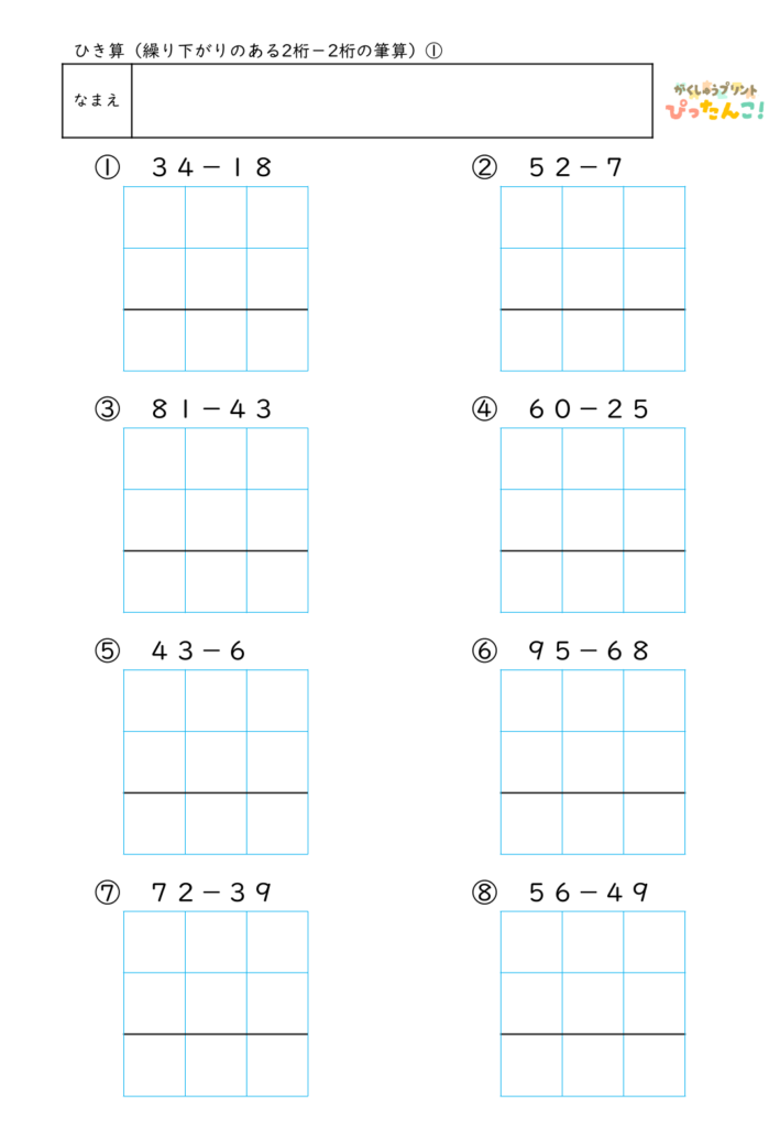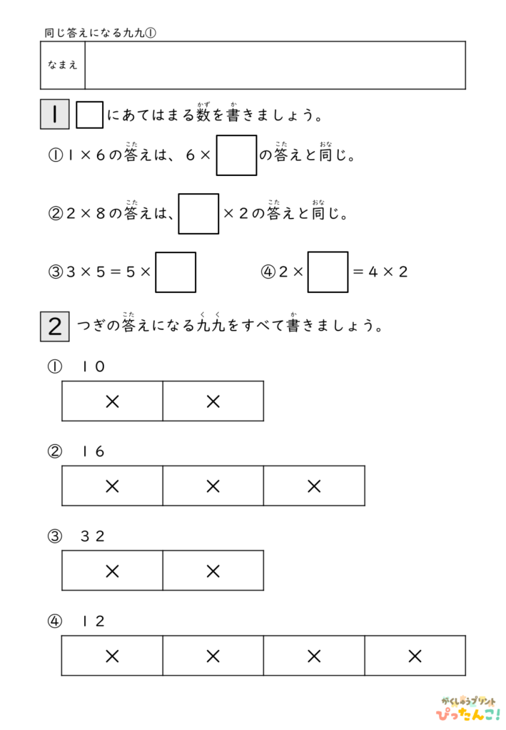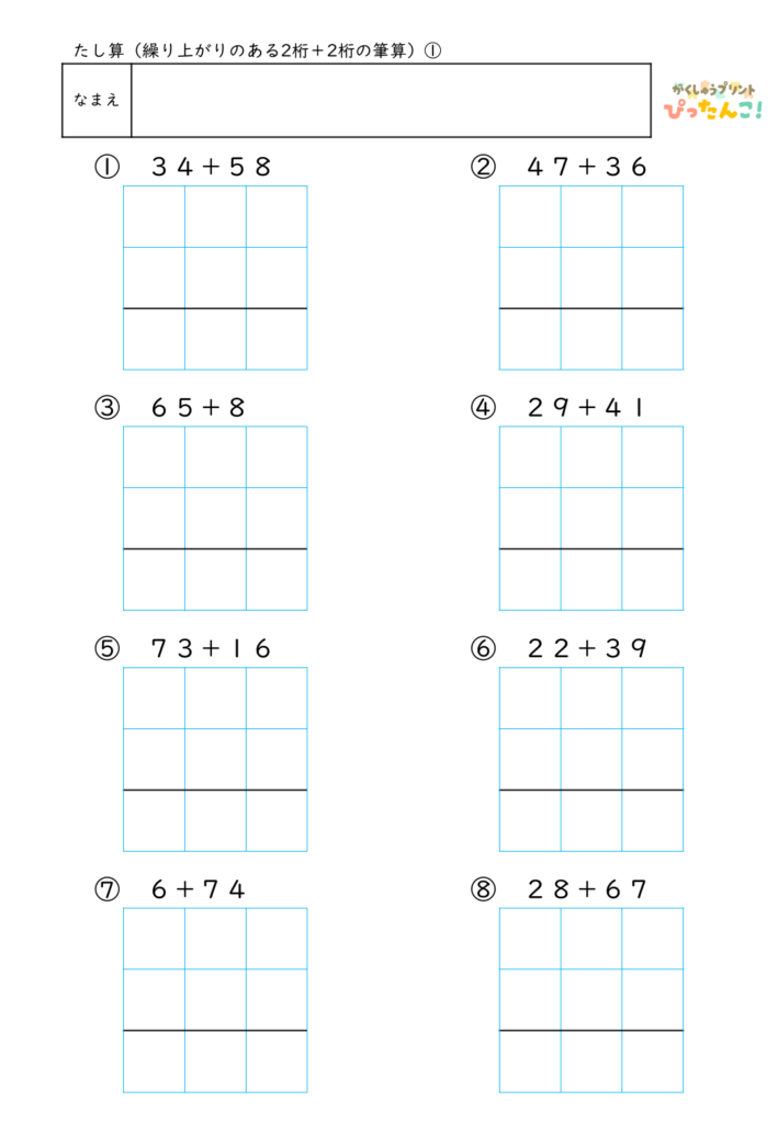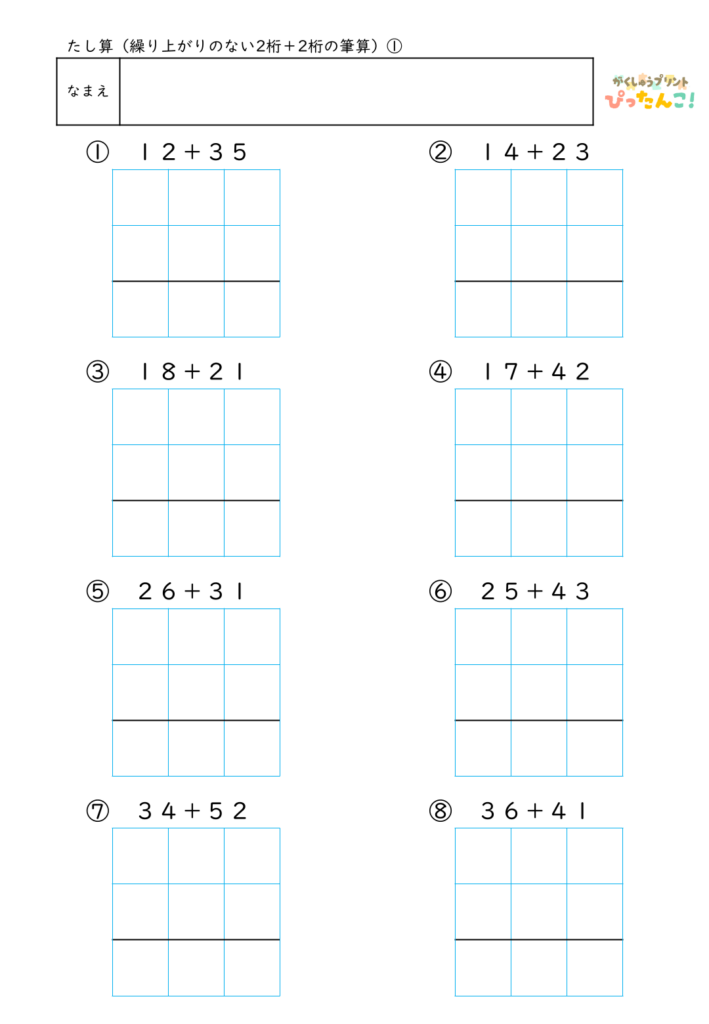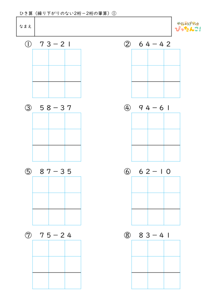 算数│小学校2年生 2026.03.23 算数TOP >小学校2年生 内容を選ぶ 内容から探す たし算 たし算の筆算 繰り上がりのない2桁+2桁 繰り上がりのある2桁+2桁 ひき算 ひき算の筆算 繰り下がりのない2桁-2桁 繰り下がりのある2桁-2桁 かけ算 九九 2つの段混合 全ての段ランダム かけ算のきまり 同じ答えになる九九 その他 かけ算 文章問題 たし算とひき算 2桁同士 その他 冬休みセット 冬休み応援セット(全10枚) 自分で作れる計算練習テンプレート たし算 ひき算 かけ算