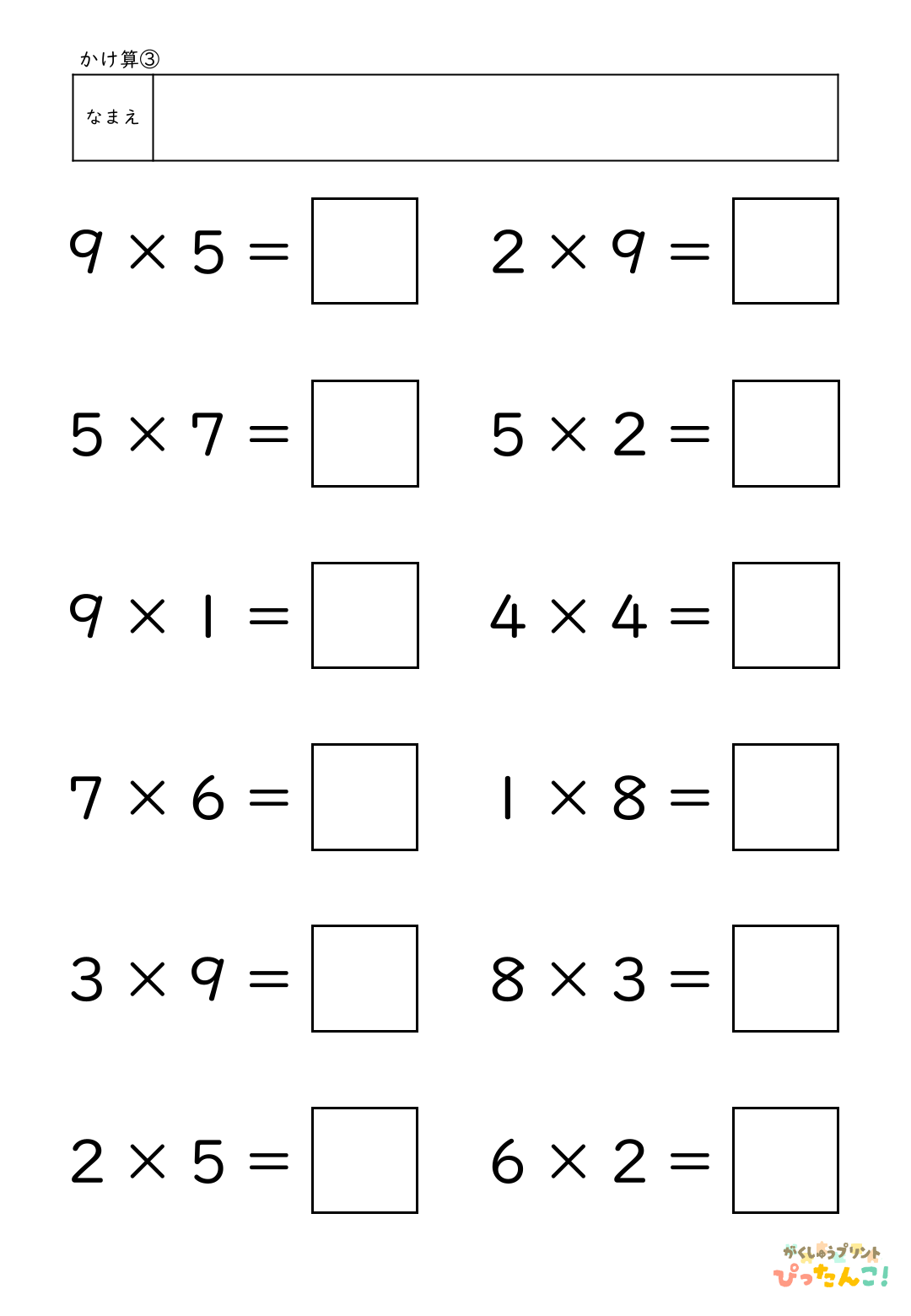 小学校2年生「かけ算」「かけ算九九づくり」で学習する九九の練習プリントです。このプリントは、かけ算九九をすべて学習した後に定着確認用として使えます。1の段から9の段までの九九がランダムに並んでおり、段の流れに頼らず式を見て考える力を育てます。シンプルな構成で取り組みやすく、解答欄には枠があるため数字を丁寧に書く練習にもなります。九九を「覚えた」から「使える」へとつなげる、復習・仕上げに適したプリントです。