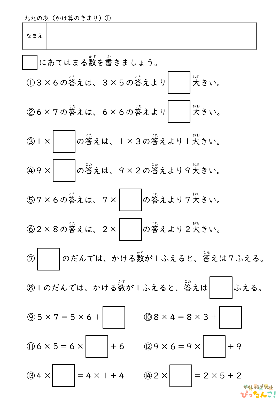 小学校2年生の「九九の表」で学習する、かけ算のきまりを定着させるための練習プリントです。かける数が1増えると、答えはかけられる数だけ増えるという規則に注目し、九九表を埋める問題や、「8×4は8×3よりいくつ大きいか」を考える問題、式で表す問題に取り組みます。九九を暗記だけで終わらせず、前の計算とのつながりを意識することで、かけ算の理解を深め、今後の学習につながる確かな土台を育てます。