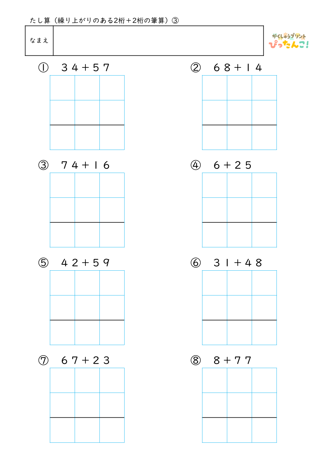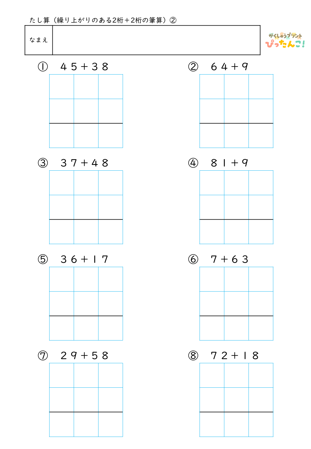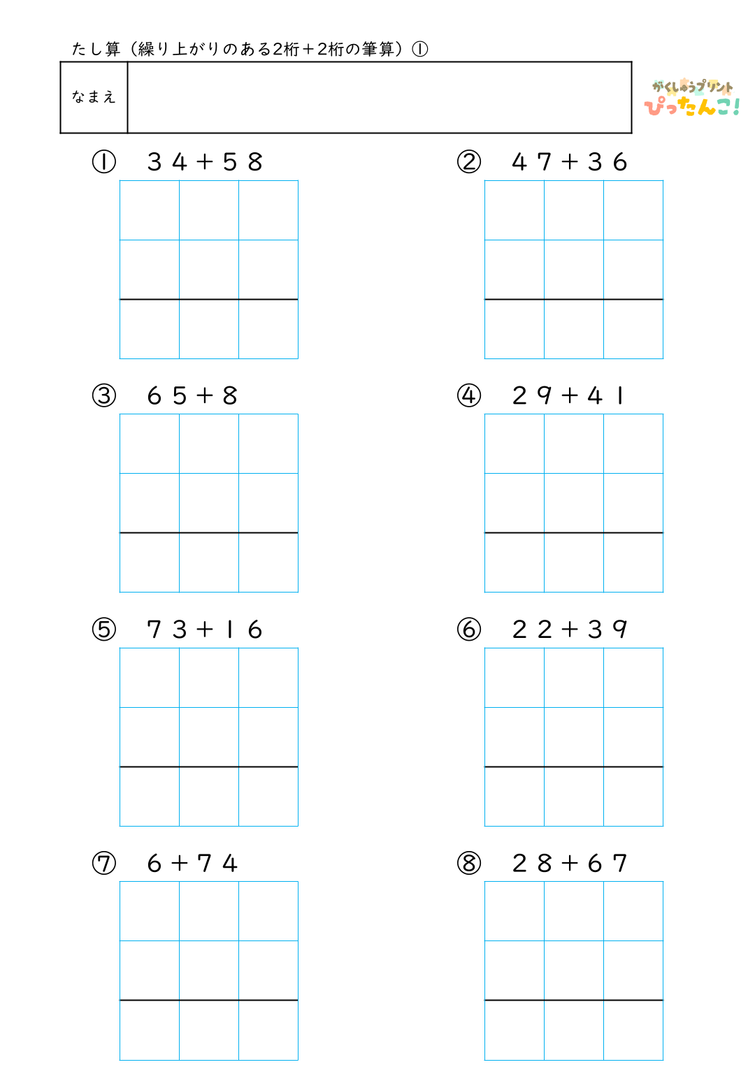 小学校2年生で学習する、2桁+2桁の繰り上がりのあるたし算の筆算練習用プリントです。一の位で繰り上がる問題で、2桁+1桁、1桁+2桁、答えが何十になる問題など、さまざまな形の繰り上がりを経験できる構成です。筆算の枠に数字や記号を書き入れて解くことで、位や手順を意識した計算が身につきます。授業・個別学習・家庭学習で活用でき、繰り上がりへの理解と算数への自信を育てるプリントです。
