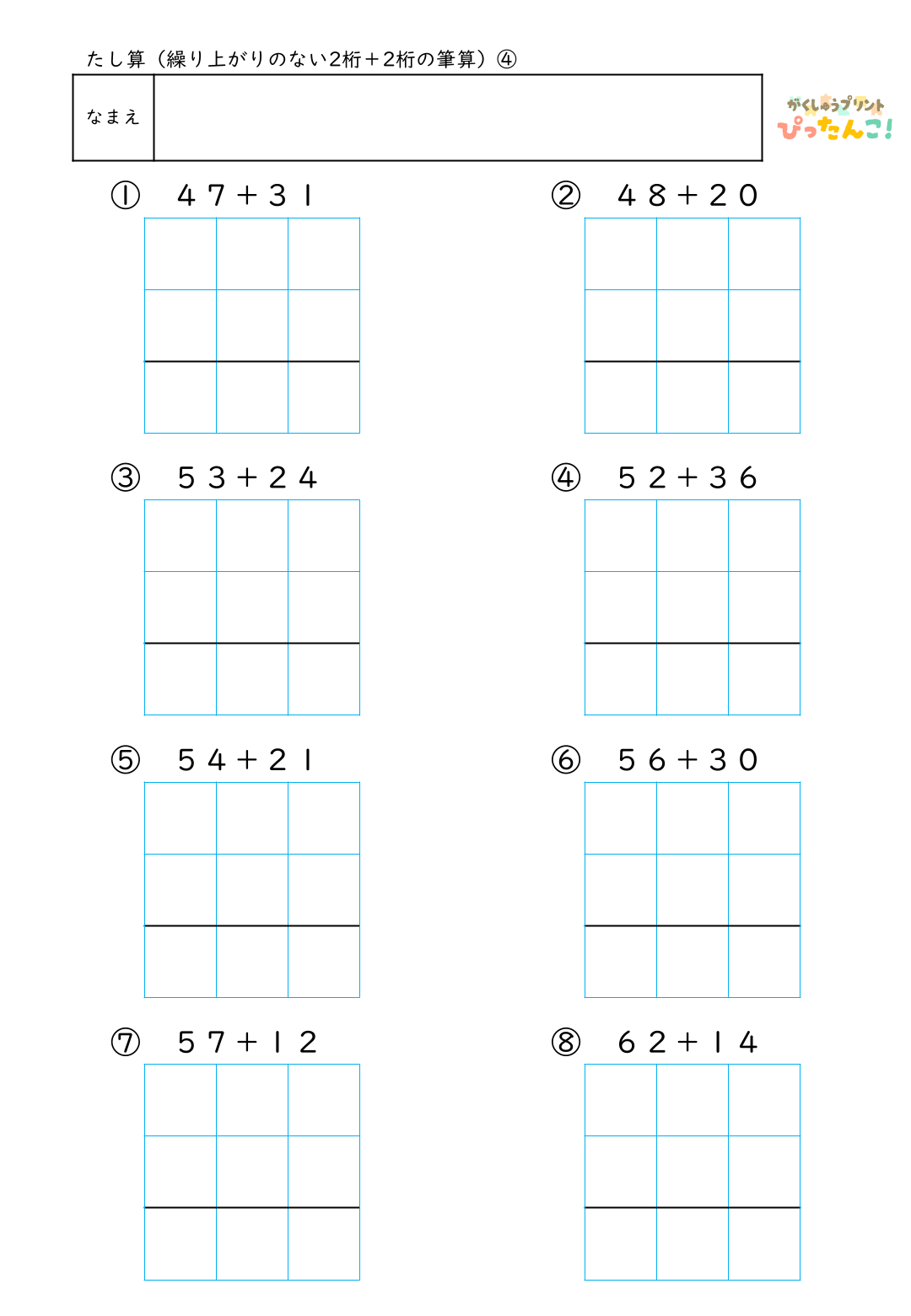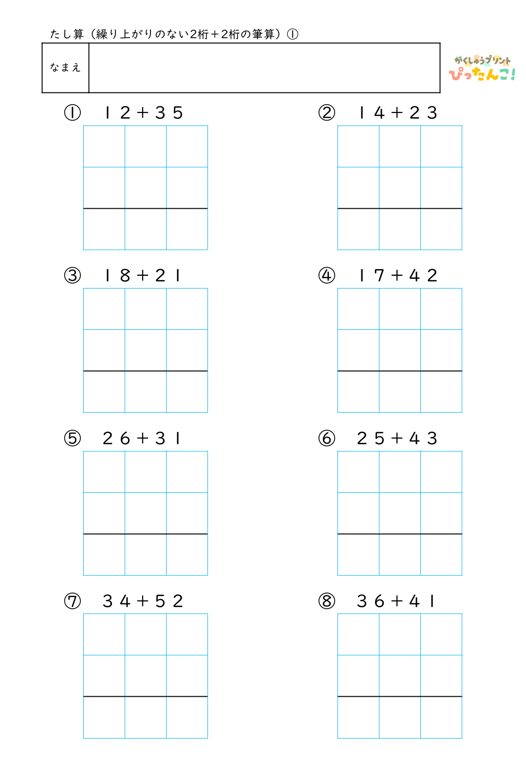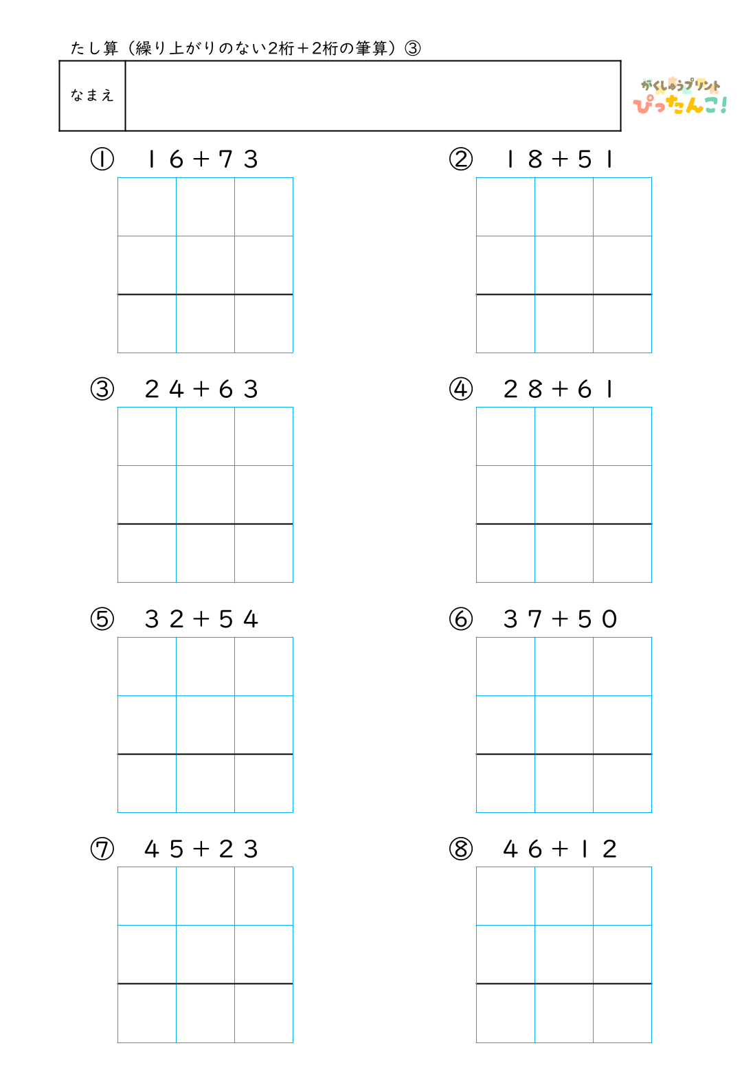 小学校2年生の「たし算」で学習する繰り上がりのない2桁+2桁の計算に取り組むための筆算練習プリントです。筆算の枠に、自分で数字や記号を書き入れて完成させる形式とし、計算よりもまず「位をそろえて書く」「一の位から計算する」といった手順の理解に集中できるよう設計しています。授業・個別支援・家庭学習など幅広い場面で活用でき、正解だけでなく過程を認める振り返りにつなげやすい構成です。筆算の基礎感覚と学習への自信を、安心したペースで育てることを目指しています。