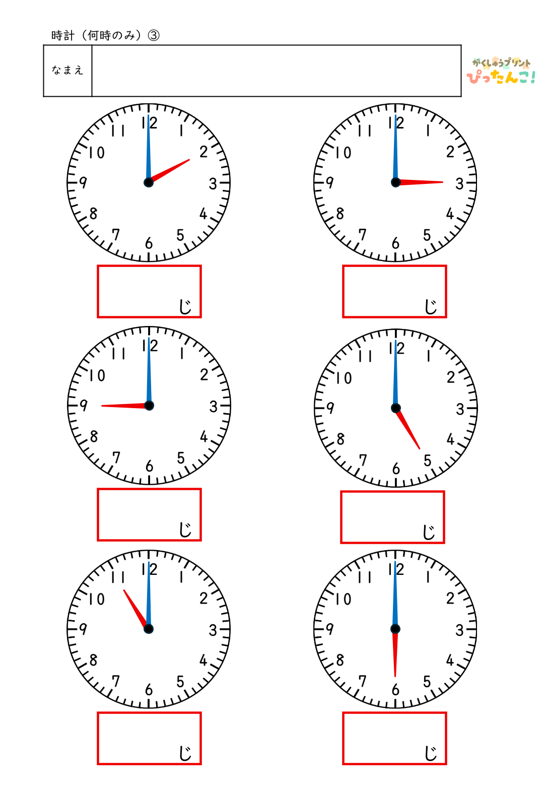 このプリントでは、短い針(何時)は赤、長い針(何分)は青で色分けされています。